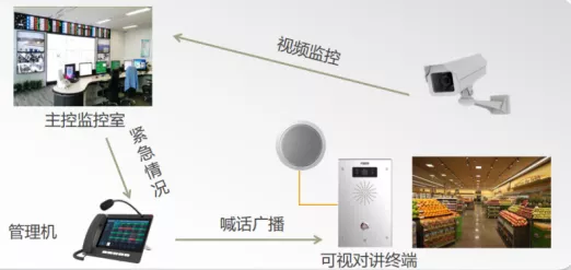 可利用管理机或系统软件进行实时监听、监视无人化商店各个连锁店的现场情况,当发现恶意破坏情况,可通过管理机主动发起广播喊话,威慑不法分子。如发生紧急情况,顾客可随时通过店内对讲系统紧急呼叫管理中心,获得帮助。
