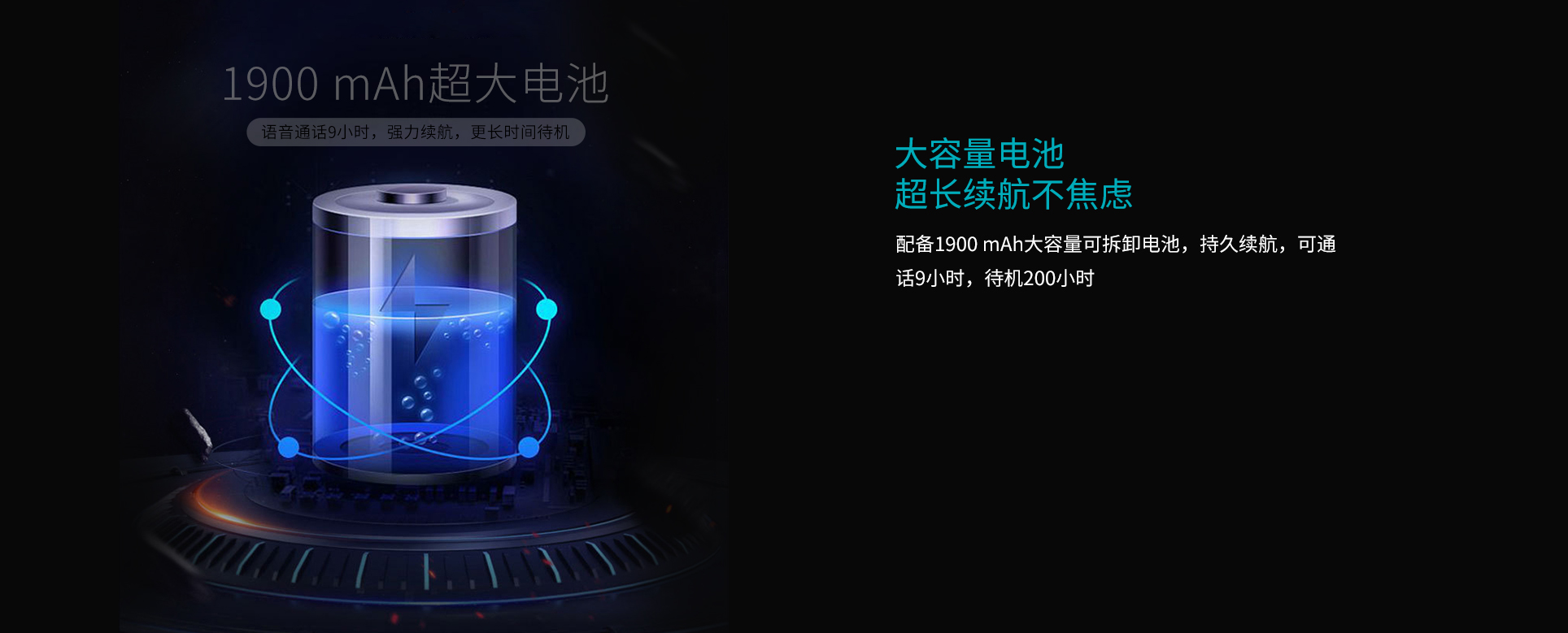 - 1900mAH大容量电池,通话9小时,待机200小时