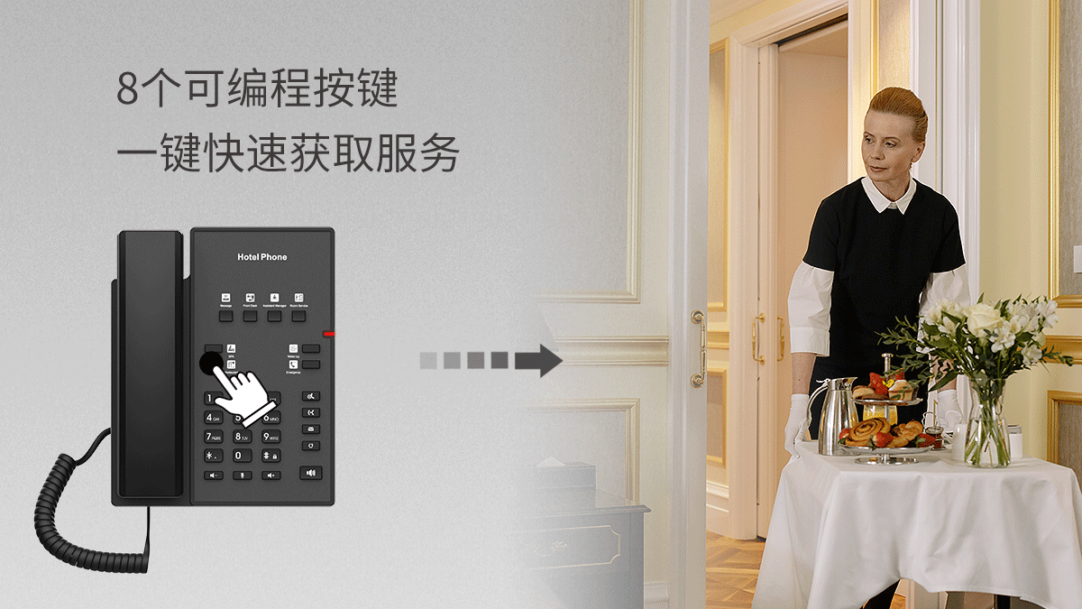 方位H1话机配备8个可编程按键,酒店可自定义客房服务热线和酒店特色功能。例如留言服务、前台服务、大堂副理、客房服务、按摩服务、叫醒服务、餐饮服务、紧急求助等。