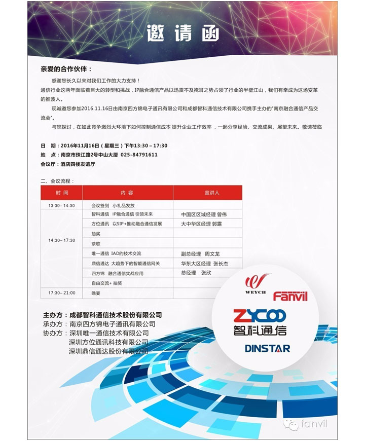 届时,方位将于2016年11月16日,深圳方位通讯科技有限公司联合成都智科通信技术股份有限公司、深圳唯一通信技术有限公司、深圳鼎信通达股份有限公司、南京四方锦电子通讯有限公司共同打造一场“南京融合通信产品交流会”诚挚邀请各位前来莅临,深入交流! 地点:南京市珠江路2号中山大厦 会议厅:酒店四楼友谊厅 |