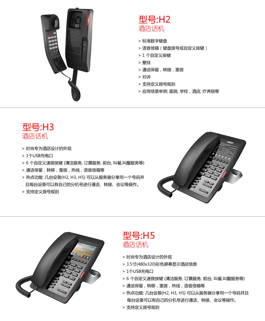 中国, 深圳, 2016/11/8 H系列是方位专为酒店设计的IP系列话机。以其时尚,现代的外观设计,高清的语音品质,丰富的功能以及完美兼容各大主流通信平台等优势,将取代传统的模拟酒店话机,成为新一代智能酒店终端设备。H系列酒店IP话机外观适用于大多数酒店风格,并满足用户对于酒店应用及通话质量的需求。方位H系列有三个机型:H2,H3和H5。 H2是专为酒店浴室、营业厅及其他服务场所设计的话机。它外形小巧,操作方便,适用于壁挂。H3和H5是专为酒店房间设计的话机。H5为H3的高配版本,拥有3.5寸彩色屏幕显示酒店信息,给酒店用户带来更好的个性化定制体验。 ? ? ? H3、H5拥有丰富的功能,如呼叫转移,热线电话,语音信箱,呼叫保留等等。H3、H5支持6个可编程按键,可以根据酒店的需求进行自定义。例如,可编程按键可进行服务热线(前台,房间清洁,叫餐,紧急通话等)或酒店特有功能(叫醒服务,语音留言等)自定义。此外,H3、H5还有一个USB口为手机等设备进行充电。 上市时间 H2/H3/H5正在进行批量生产,欢迎大家进行预订。 联系方式 loui.guo@fanvil.com, (+86 755) 26647589 sales@fanvil.com |