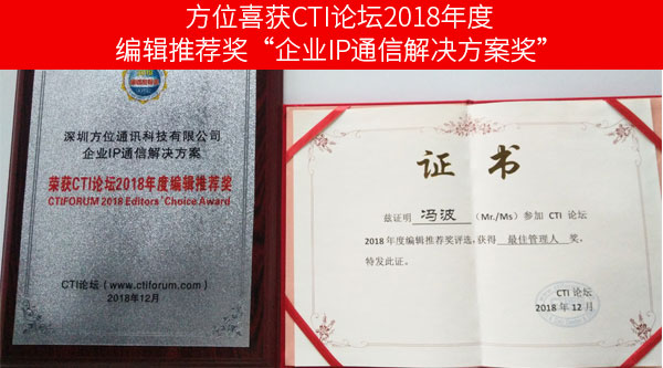 2018年12月20日,由中国计算机和通信领域里的网络社区和门户网站CTI论坛主办的"行业应用及市场分析主题沙龙暨2018年度CTI论坛编辑推荐奖颁奖"活动在北京成功召开,并正式公布了"2018年度CTI论坛编辑推荐奖"的评选结果。"