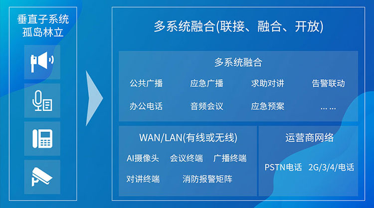 数字化转型浪潮之下,公共广播多系统融合的趋势也日益明显。互联互通的公共广播系统不仅能提高办公及生产效率,还可以极大地降低实际运营成本。 然而现市场上的公共广播仍是以传统模拟广播、私有IP协议广播为主,可实现功能、应用场景单一,可扩展性差;彼此独立的厂商产品,形成的信息孤岛,导致功能无法互通;此外,对不同厂商的多类广播系统的运维管理问题,也给企业IT人员增加了很多额外负担,广播行业走向“融合”是大势所趋。