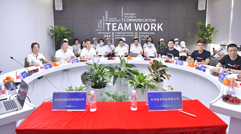 雅观科技地产事业部副总裁伍江山、方位通讯生态合作总监黄永威分别代表双方签署了战略合作协议。雅观科技CIO高健伦、雅观科技智慧空间研究院副院长王贺、副总经理范俊鹏,方位通讯CEO冯波、市场销售总监杨敬一、行业销售总监江桂林等相关领导出席,与几十位方位通讯国内渠道合作伙伴一同见证了这一重要时刻。 当天上午,雅观科技CIO高健伦一行来到位于深圳宝安区的方位通讯总部,方位通讯CEO冯波热情接待了高健伦一行。双方首先就各自企业的发展情况作了介绍,并就智慧社区、全屋智能行业的发展情况作了互动交流。