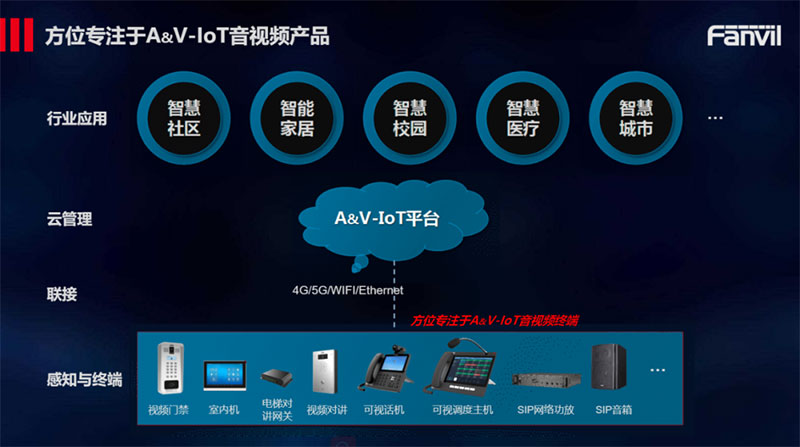 方位通讯CEO冯波致辞 回首来时路,方寸见真章。在开场致辞中,方位通讯CEO冯波对全体经销商伙伴在过去一年里给予的全力支持表示了衷心的感谢。虽然2020年是形势严峻的一年,但全体经销商伙伴的共同努力下,方位通讯在全球市场取得逆势增长的显著成绩,实现了在销售、产品、研发等方面跨越式的发展。 “十四五”规划聚焦数字经济与物联网发展,未来5年,各行各业必将掀起新一轮数字化转型浪潮,物联网发展的驱动力将更加强劲。作为领先的专业物联网音视频(A&V-IoT)产品提供商,方位通讯未来将更加积极地迎接行业变革,从品牌力升级、产品力升级、渠道力升级和服务力升级等方面,全面提升方位通讯的行业竞争力,携手渠道伙伴们,助力各行各业数字化转型升级,构建无边界沟通的智能世界,让沟通创造美好价值。 A&V-loT加速各行业数字化转型