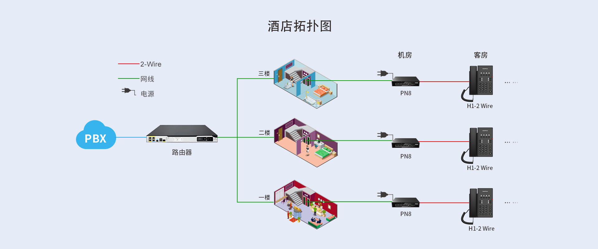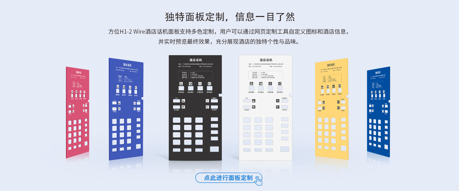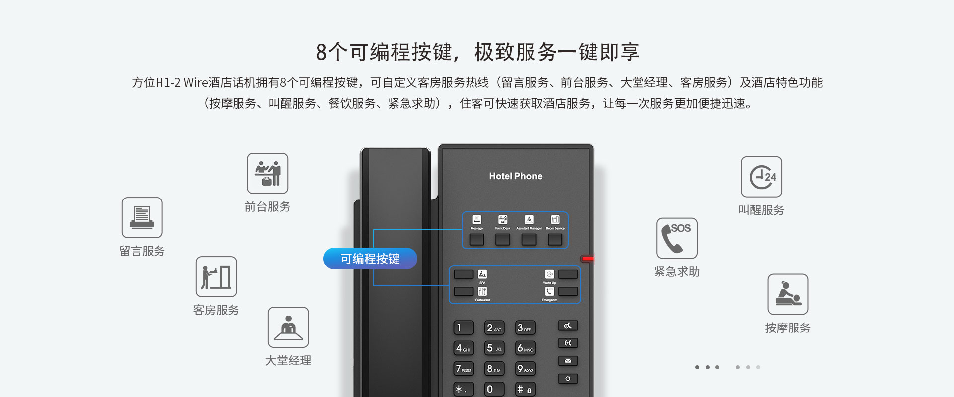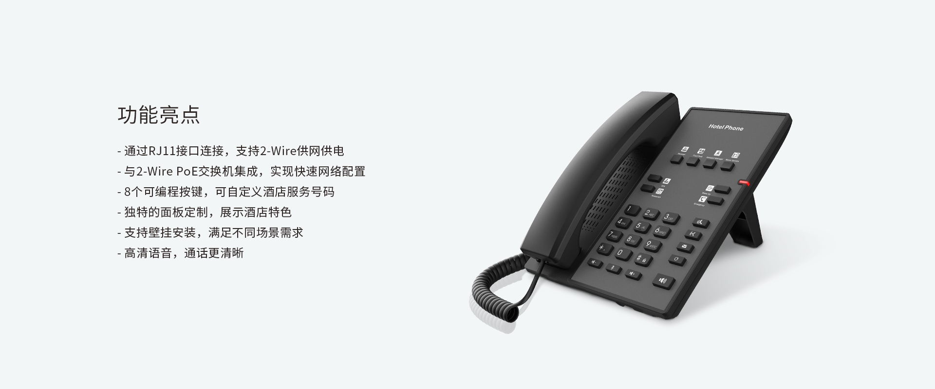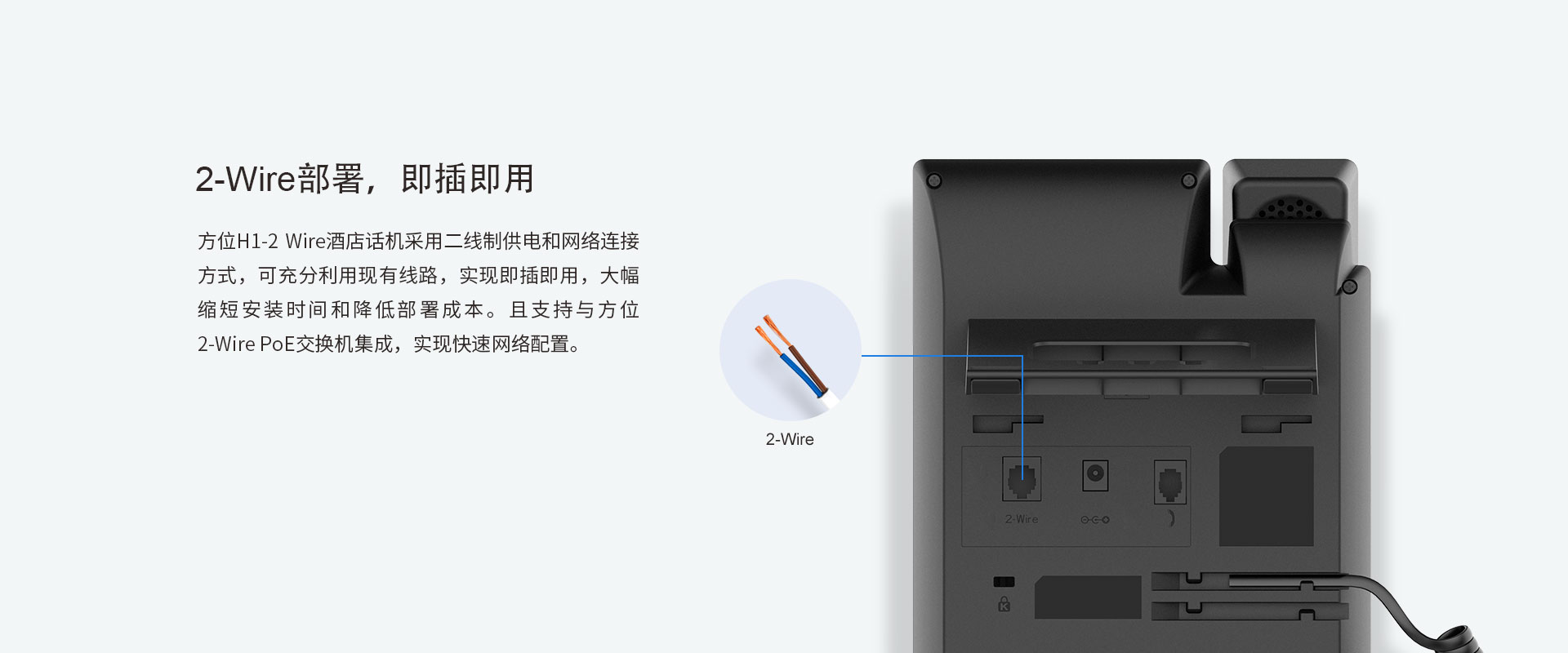 方位H1-2 Wire酒店话机在原有IP话机的基础上,采用全新二线制供电与网络连接技术,可以完全复用现有老旧线路,无需重新布线。拥有8个可编程按键,支持高清语音与2-Wire PoE供电功能,全面满足酒店多元化入住场景需求。低成本且快速的部署助力酒店话机网络升级,提升酒店运营效率及客人的使用体验。