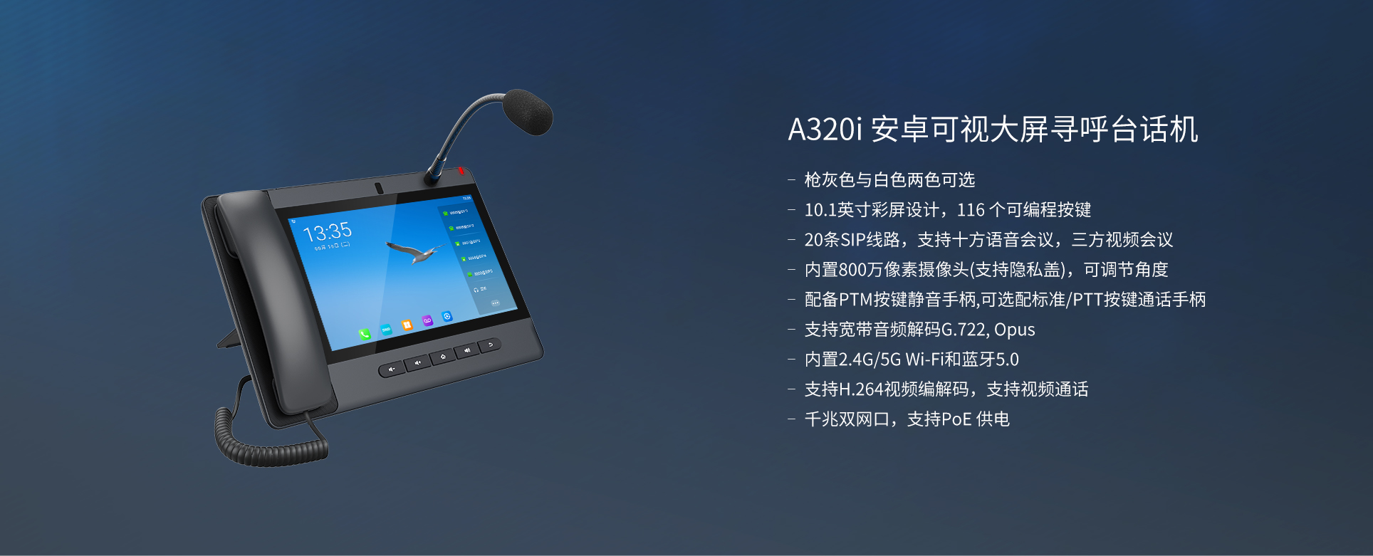 方位A320i是专门针对行业用户需求研发的一款可视大屏寻呼台话机产品,枪灰色、白色可选,满足不同喜好及场景需求。配备鹅颈麦克风和PTM按键静音手柄,支持高清语音通话。拥有10.1英寸彩色高清触摸屏,搭载安卓9.0操作系统,为用户带来更加流畅和智能化的使用体验。兼容标准SIP协议,可作为监控中心、指挥中心管理主机使用,可对管理辖区内的主机和分机进行呼叫、双向对讲、监听/监视、广播喊话。A320i能够让企业最大化地提升日常业务管理效率和应急情况处理能力。