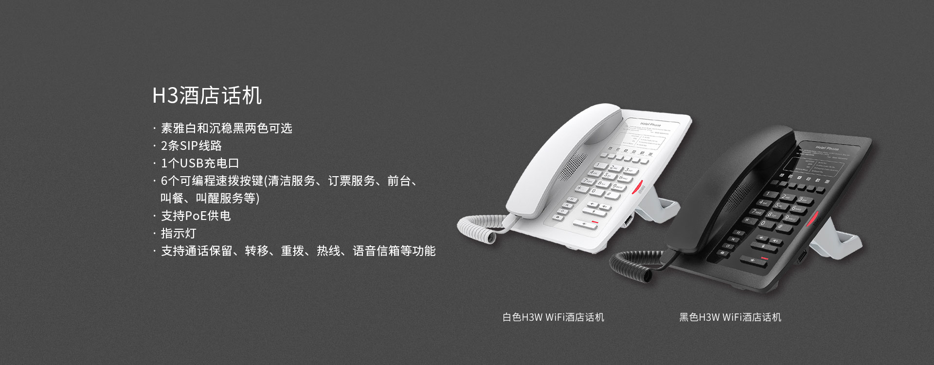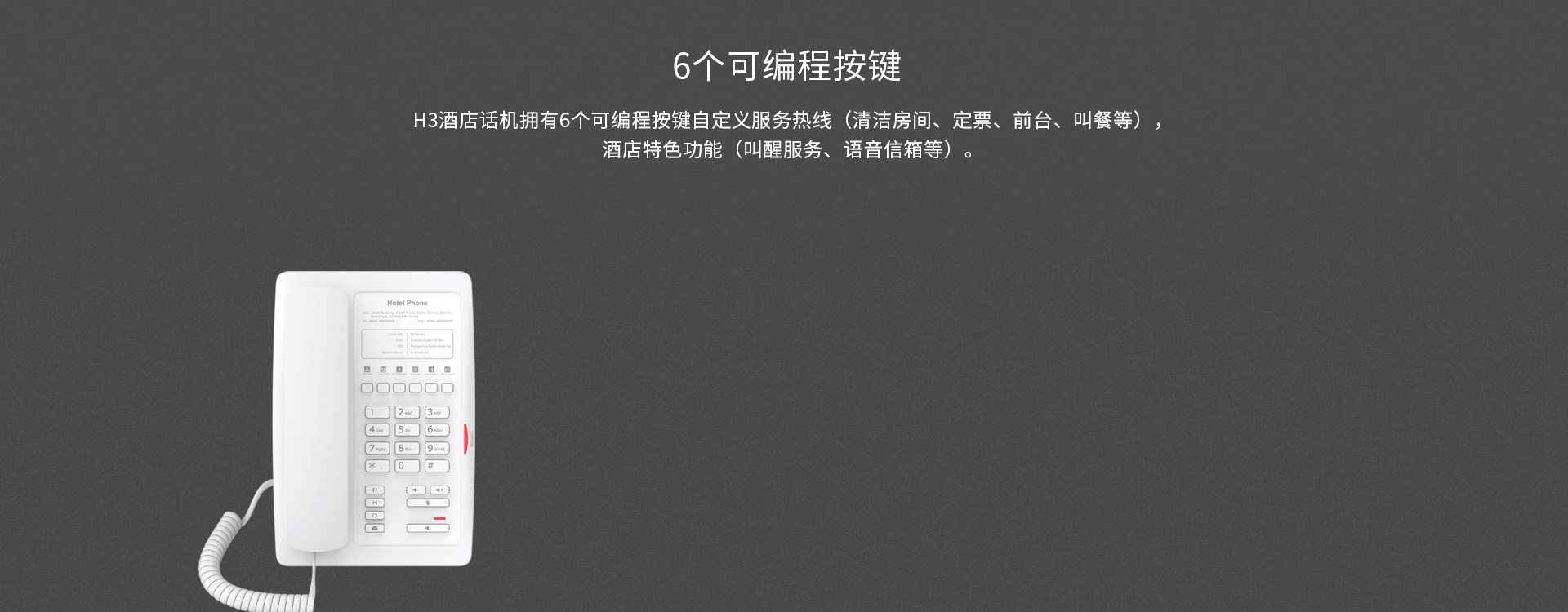 方位H3酒店IP话机外观精致优雅,拥有素雅白和沉稳黑两种颜色,适合不同的酒店设计风格。除此之外,方位H3还拥有丰富的话机功能,可自定义服务热线、快速拨号、语音留言等。