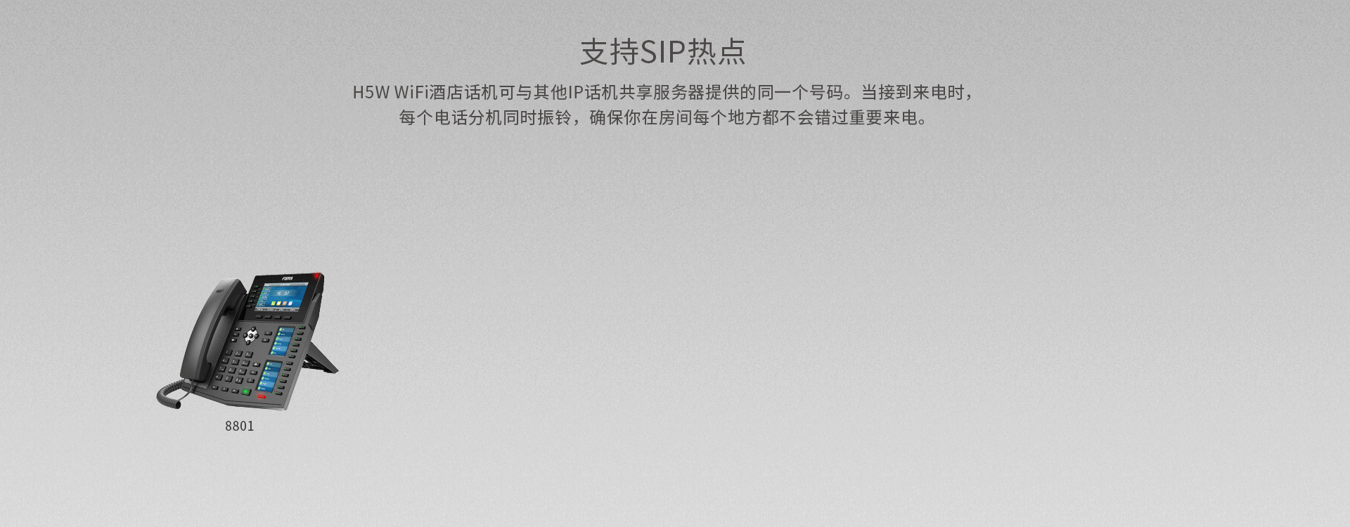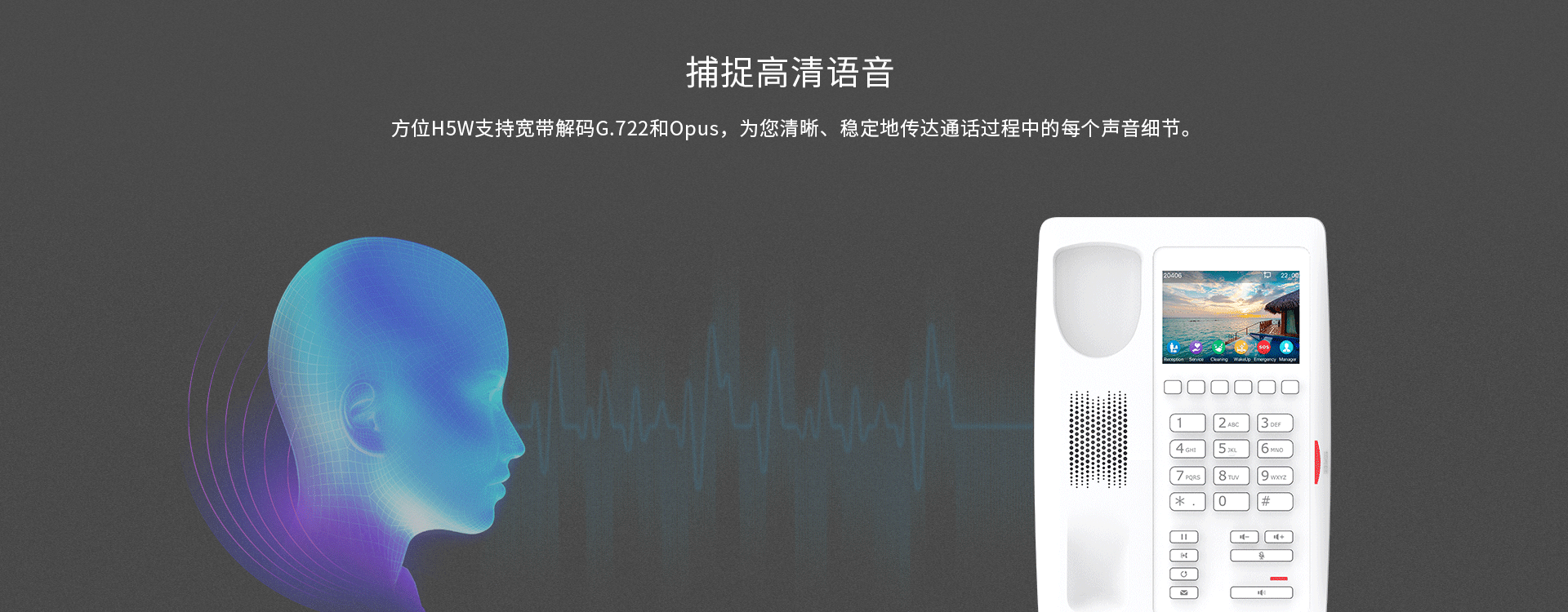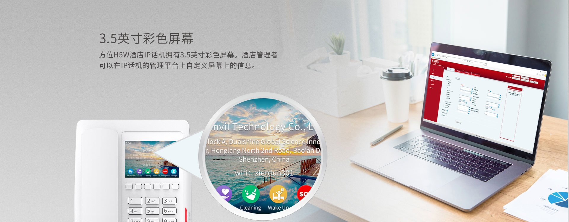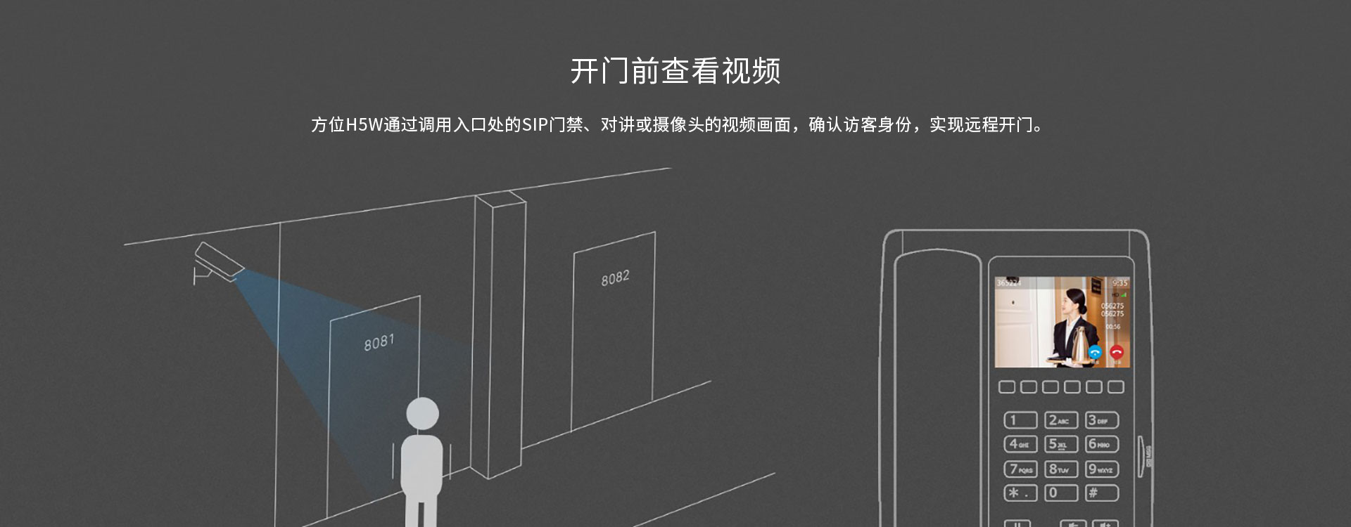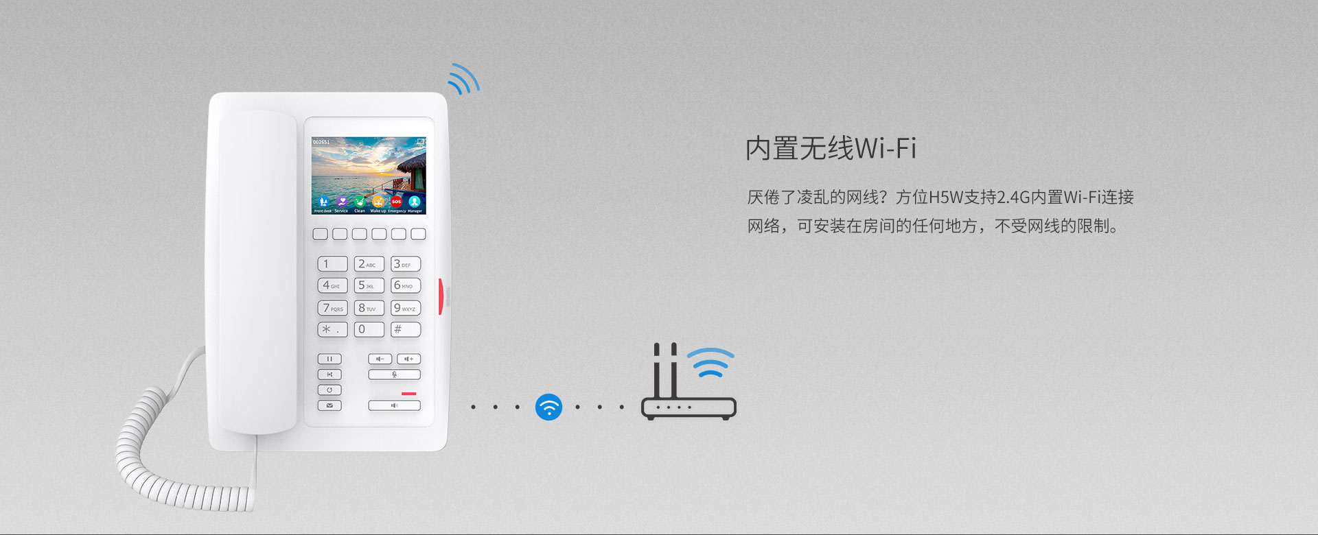 作为一款高颜值彩屏Wi-Fi IP话机,方位H5W内置2.4GWi-Fi,为您提供更加流畅的通信体验,免除网络布线的烦恼。方位H5W支持H.264视频解码,用户可在开门前查看视频图像,适用于酒店、超市、医院以及商场等场景。
