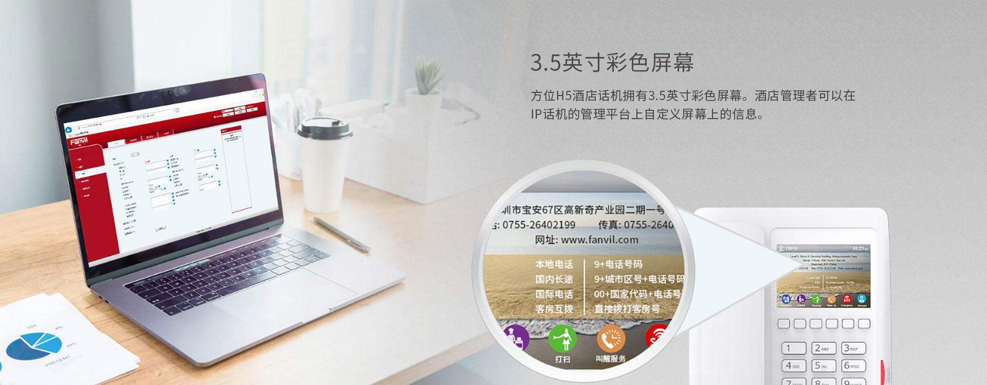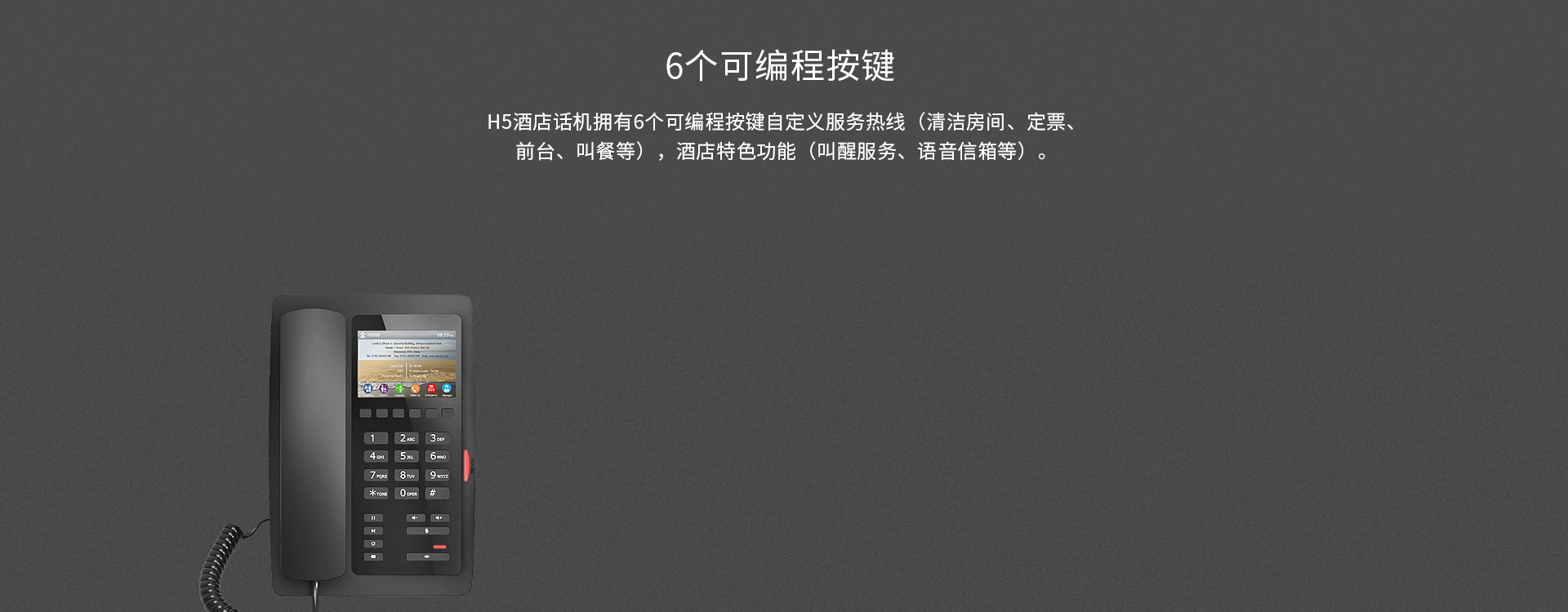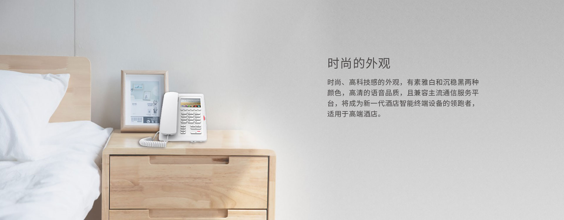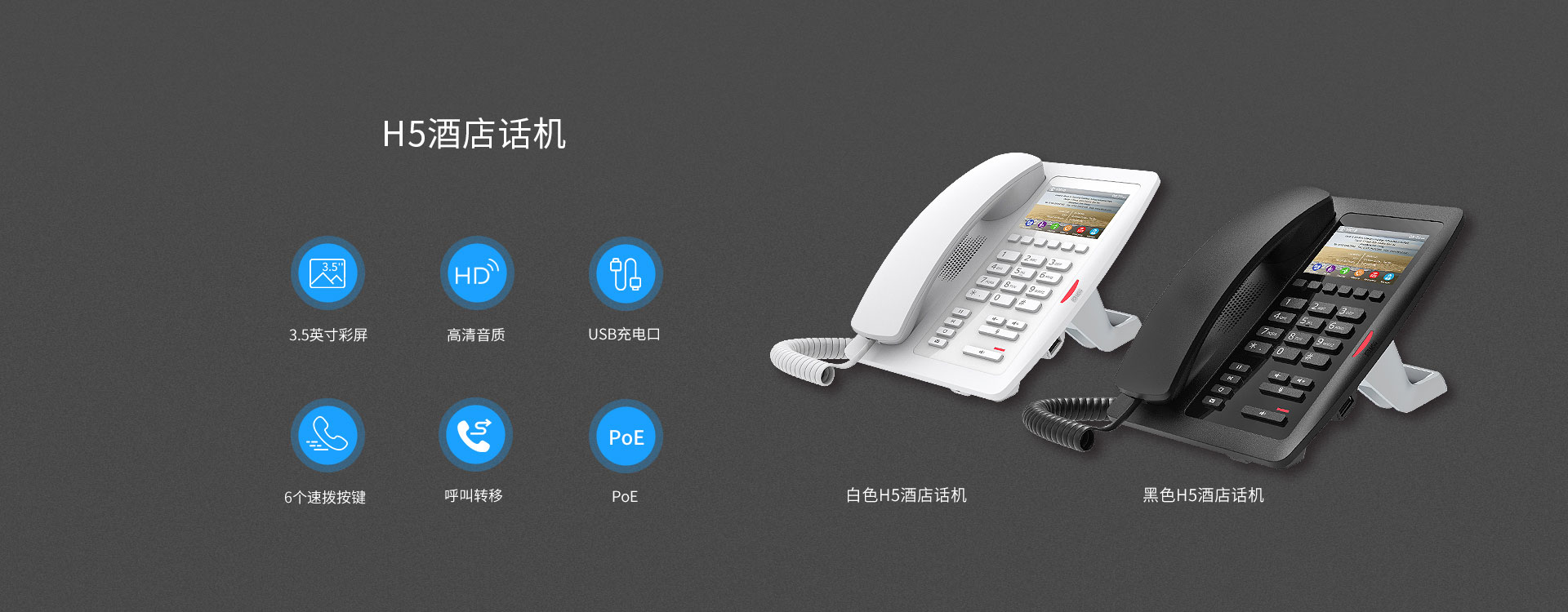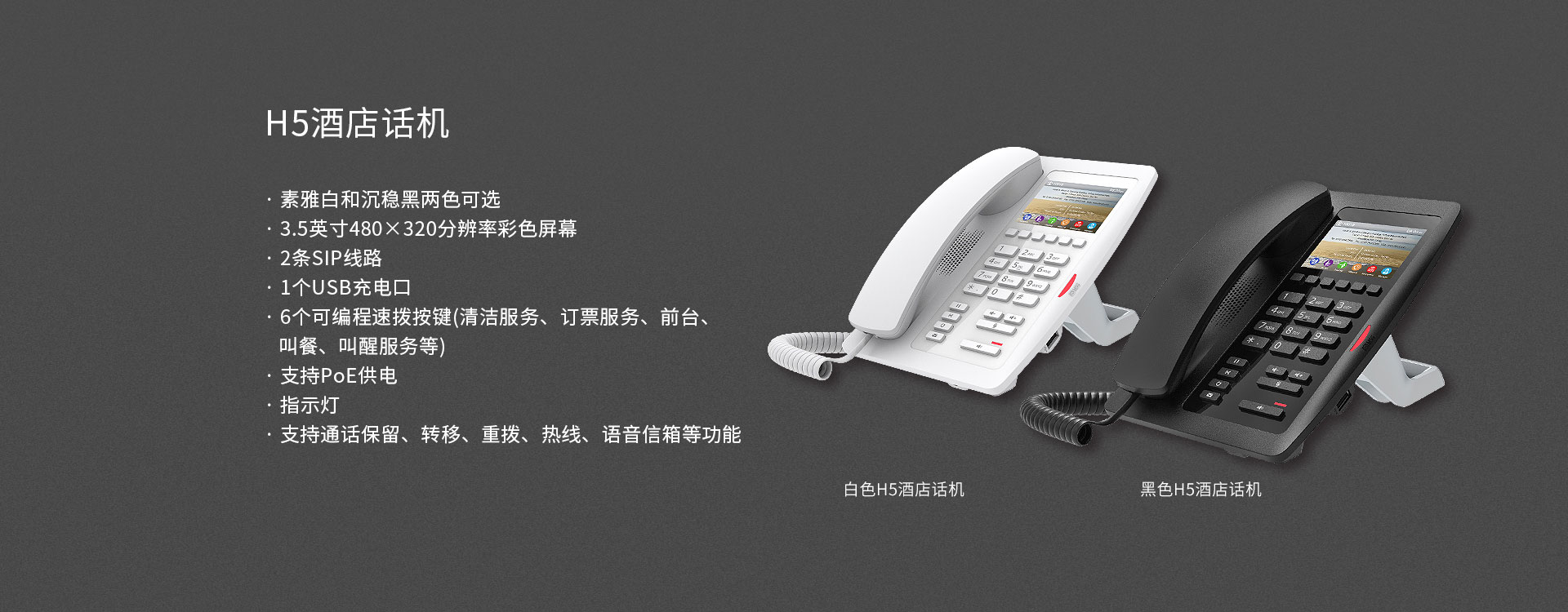方位H5酒店IP话机外观精致优雅,拥有3.5英寸的彩屏,有素雅白和沉稳黑两种颜色,适合不同的酒店设计风格。除此之外,方位H5还拥有丰富的话机功能,可自定义服务热线、快速拨号、语音留言等。