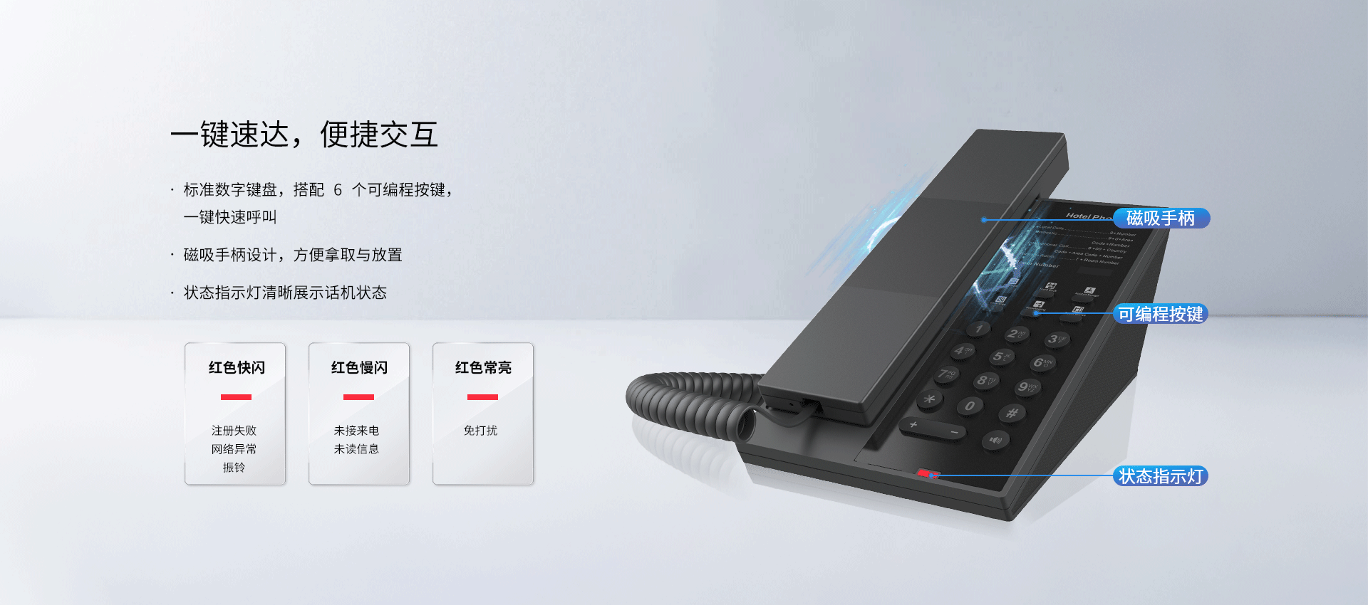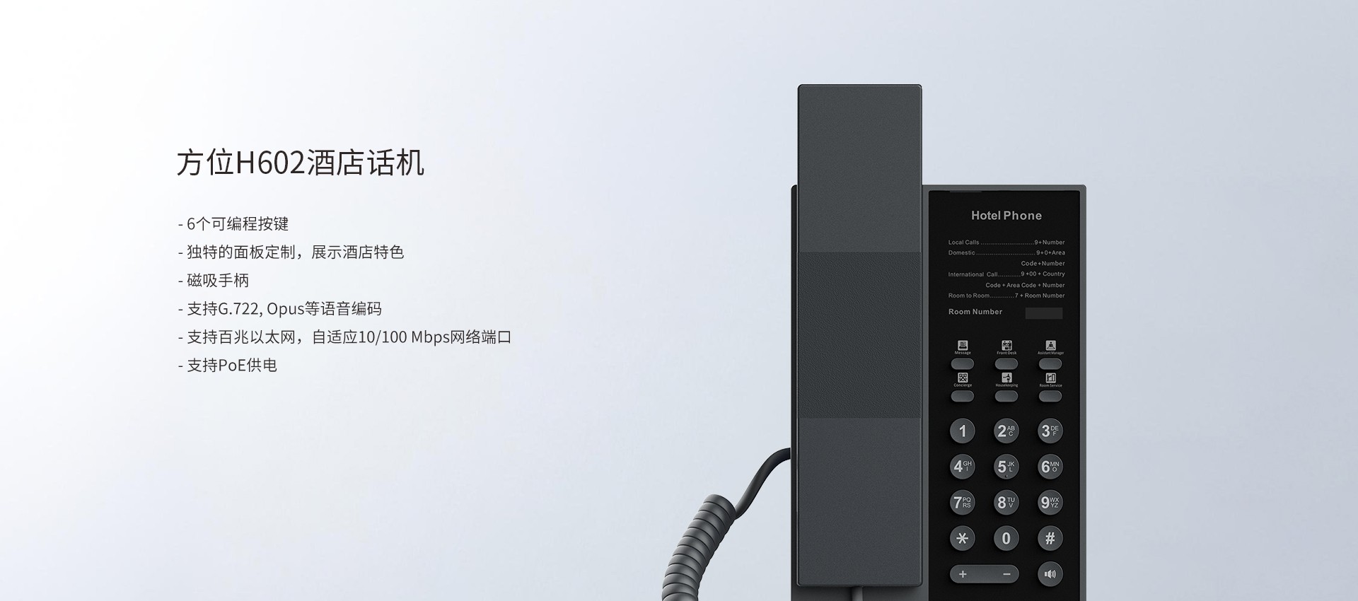 方位H602作为一款经济实用、外观优雅的无屏酒店IP话机,配备6个可编程按键,支持宽频Opus高清语音编码,满足酒店、商场、医院、超市等各种场景灵活部署的需求,为用户提供便捷高效的使用体验。
