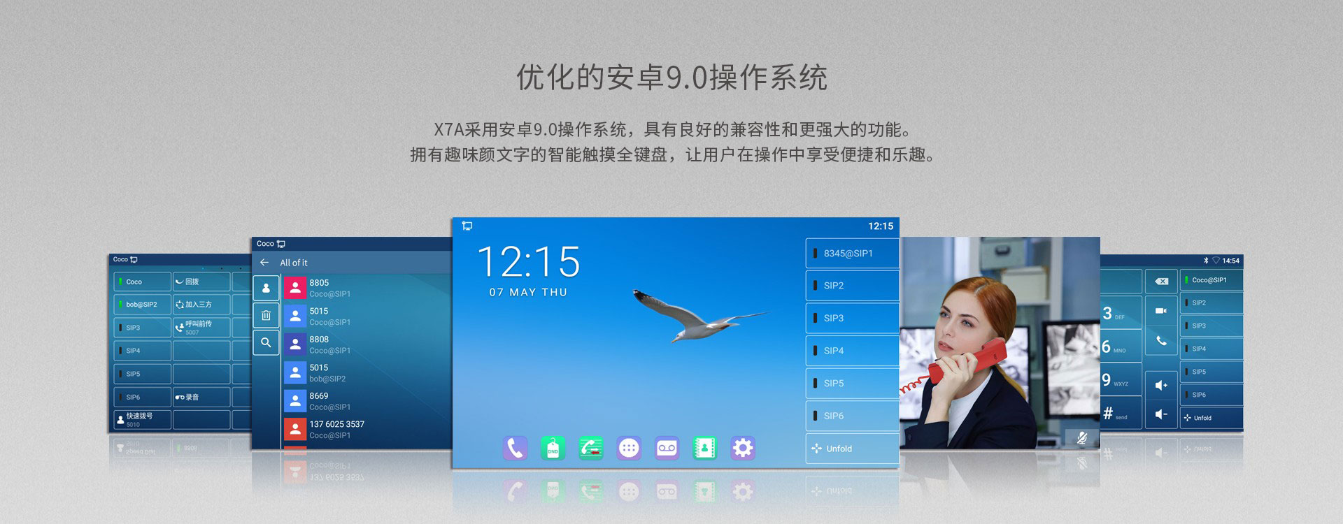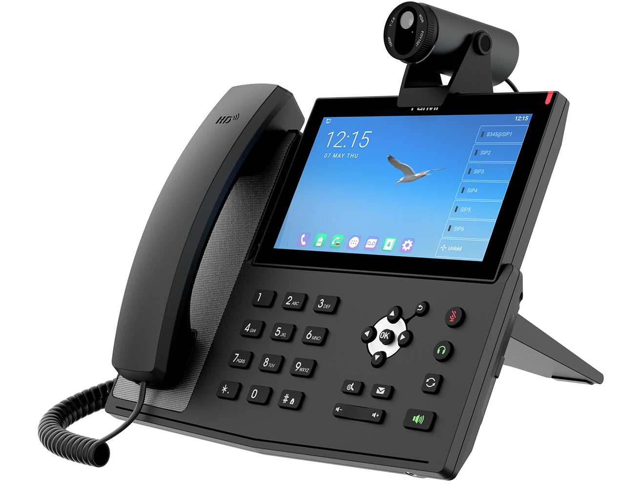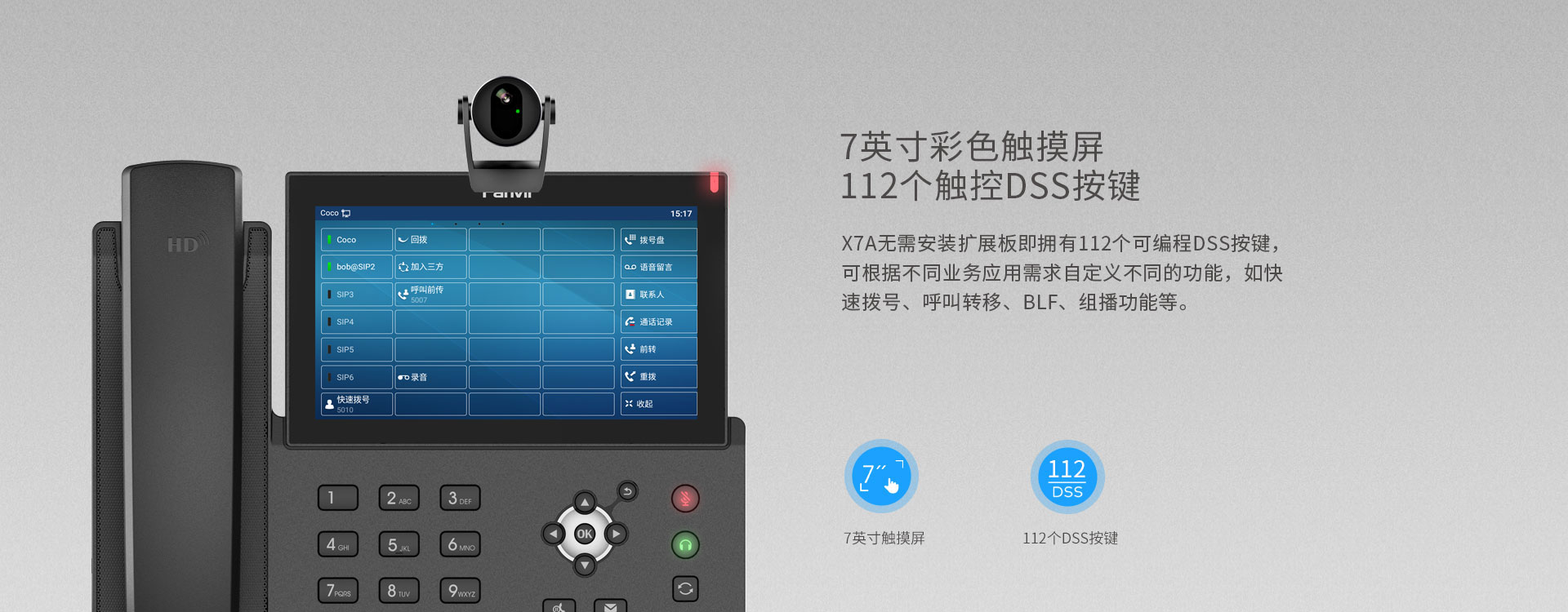 配备方位1080P高清USB摄像头CM60,让方位X7A高端触屏话机更加如虎添翼,可进行高清视频通话,让用户享受高品质音视频会议体验。搭载安卓9.0操作系统,方位X7A为用户提供更加便捷、流畅和智能化的操作体验。7英寸彩色触摸屏上可设置112个DSS按键,常用操作一键完成。内置2.4G/5G Wi-Fi实现话机无线联网,并可通过内置蓝牙功能连接蓝牙耳机。方位X7A强大的功能让日常沟通更简单、更高效。