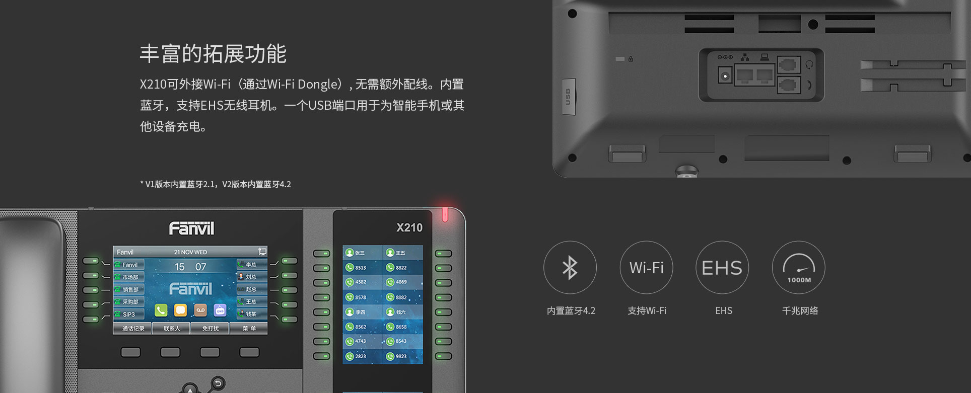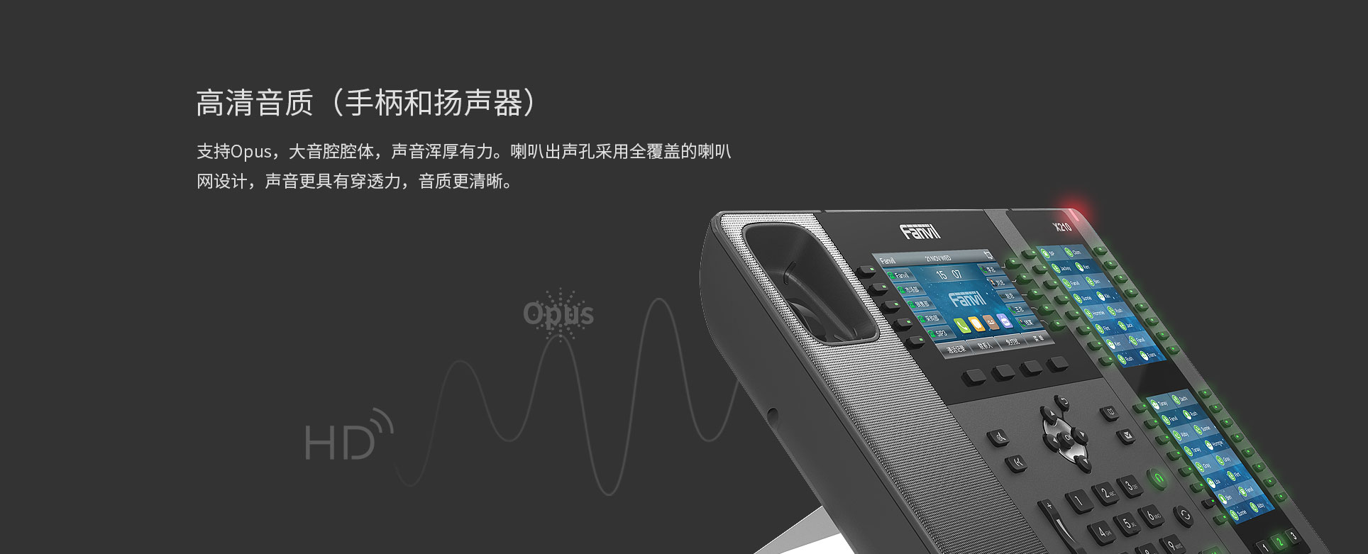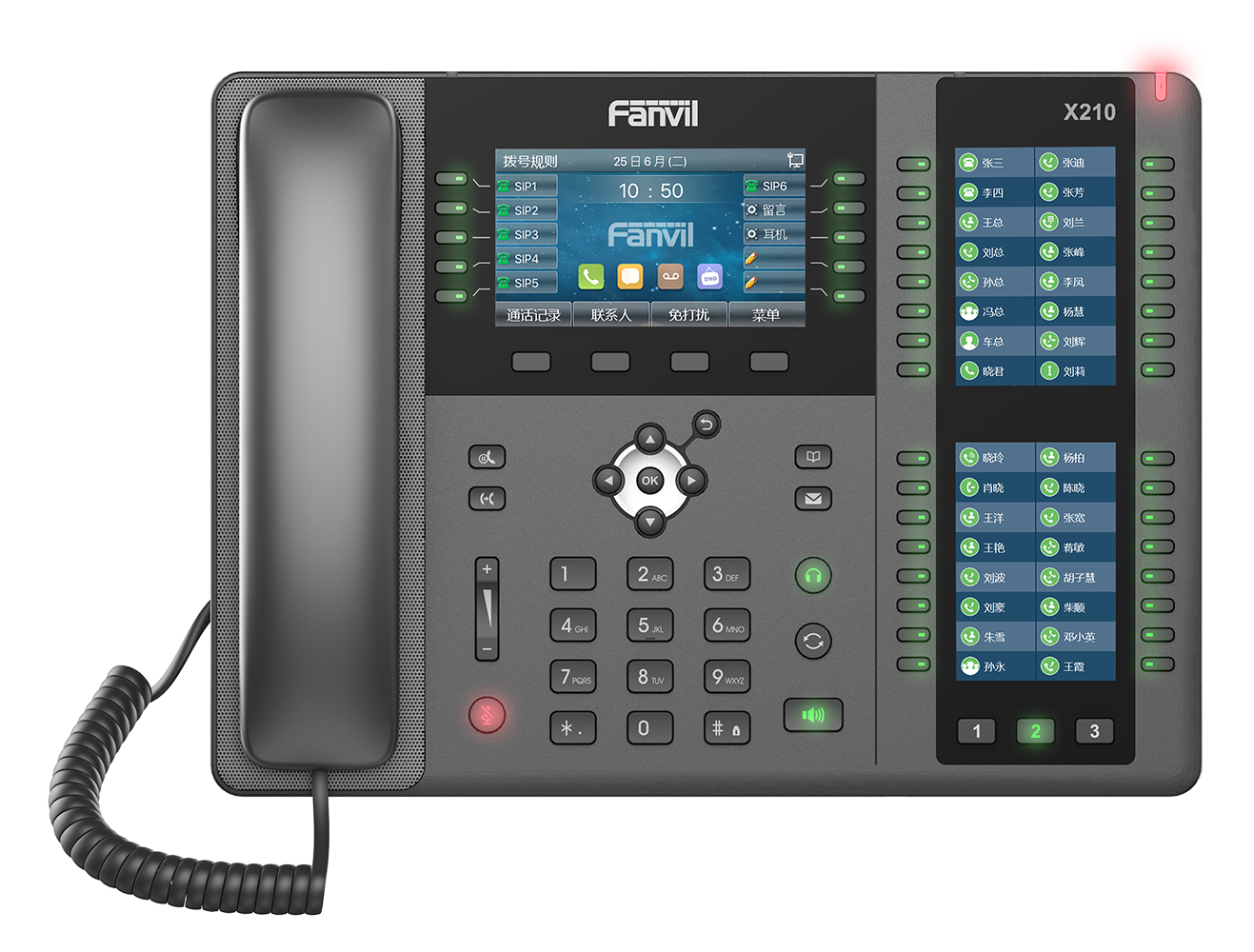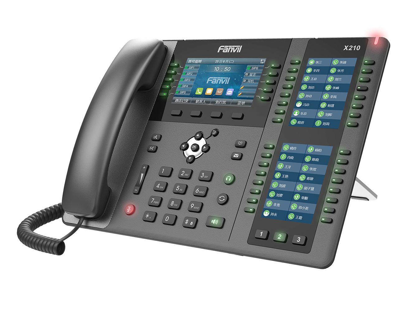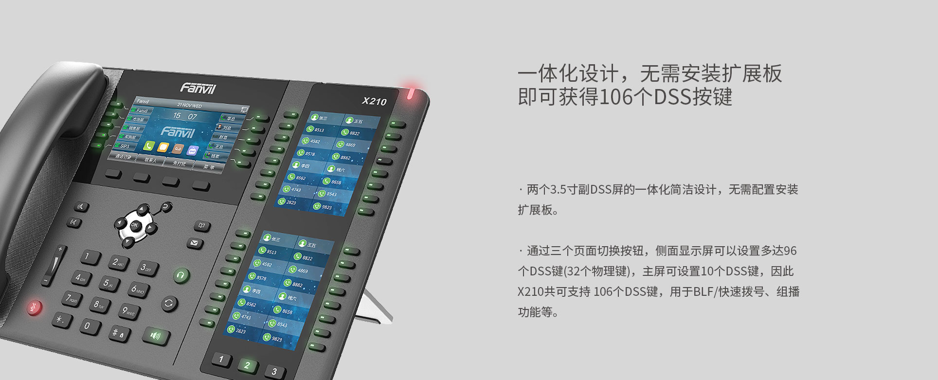 X210是一款高端商务IP话机,适用于需要灵活性和高级功能的用户,以便在工作中轻松应对繁忙的电话通讯。X210的4.3英寸主彩色显示屏上有10个DSS按键,两个3.5英寸侧面彩色显示屏上最多可配置96个DSS按键(32个物理按键),因此X210最多可配置106个DSS按键,用于设置BLF/快速拨号、组播功能等。X210还配备了高清语音,内置蓝牙,支持Wi-Fi连接,支持EHS,千兆双网口,PoE,可与IP摄像头/视频门禁连接。配备高端功能的X210能够极大的提高企业通讯效率。