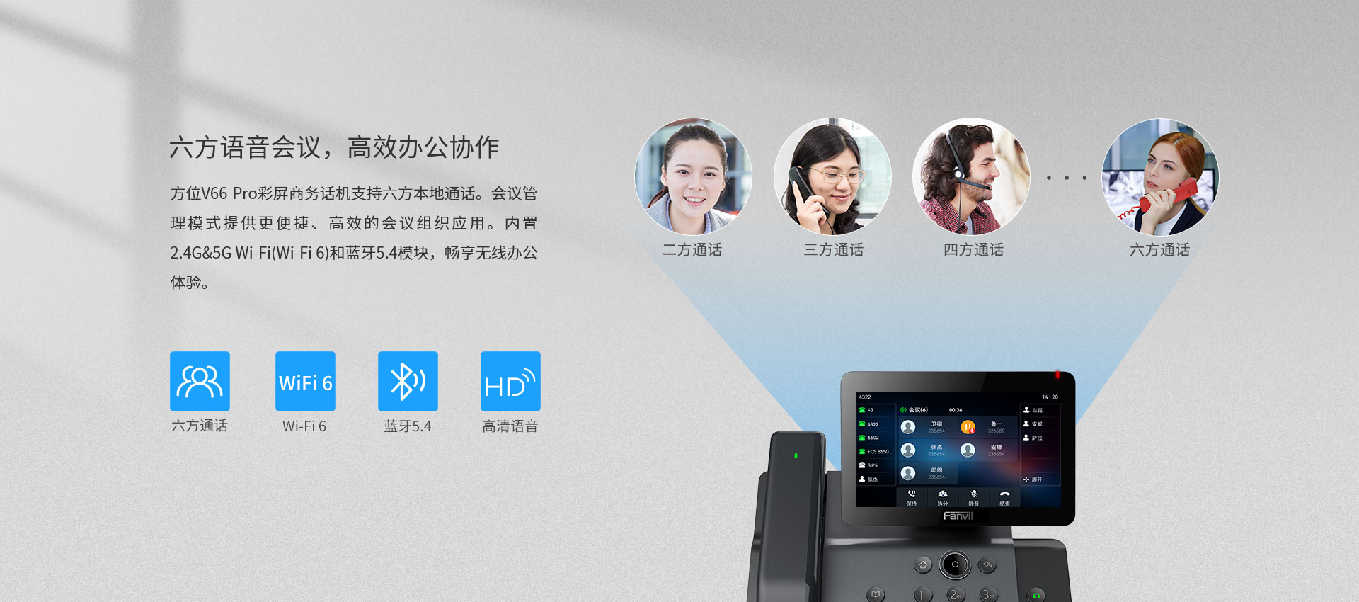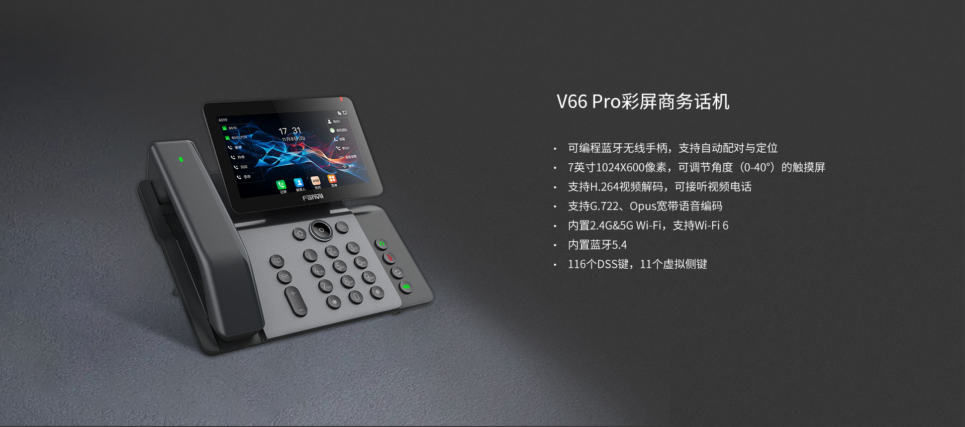 方位V66 Pro彩屏商务话机专为高级商务用户量身定制,集高清音视频于一体。搭载可编程蓝牙无线手柄,支持自动配对与查找,提供卓越的交互体验与舒适的即时互联沟通。其7英寸高清“悬浮智屏”带来极致视觉享受,超高清音质确保通话清晰自然,抗菌设计保障使用安全卫生。内置蓝牙5.4及双频2.4G/5G Wi-Fi(支持Wi-Fi 6),实现稳定快速的无线连接。