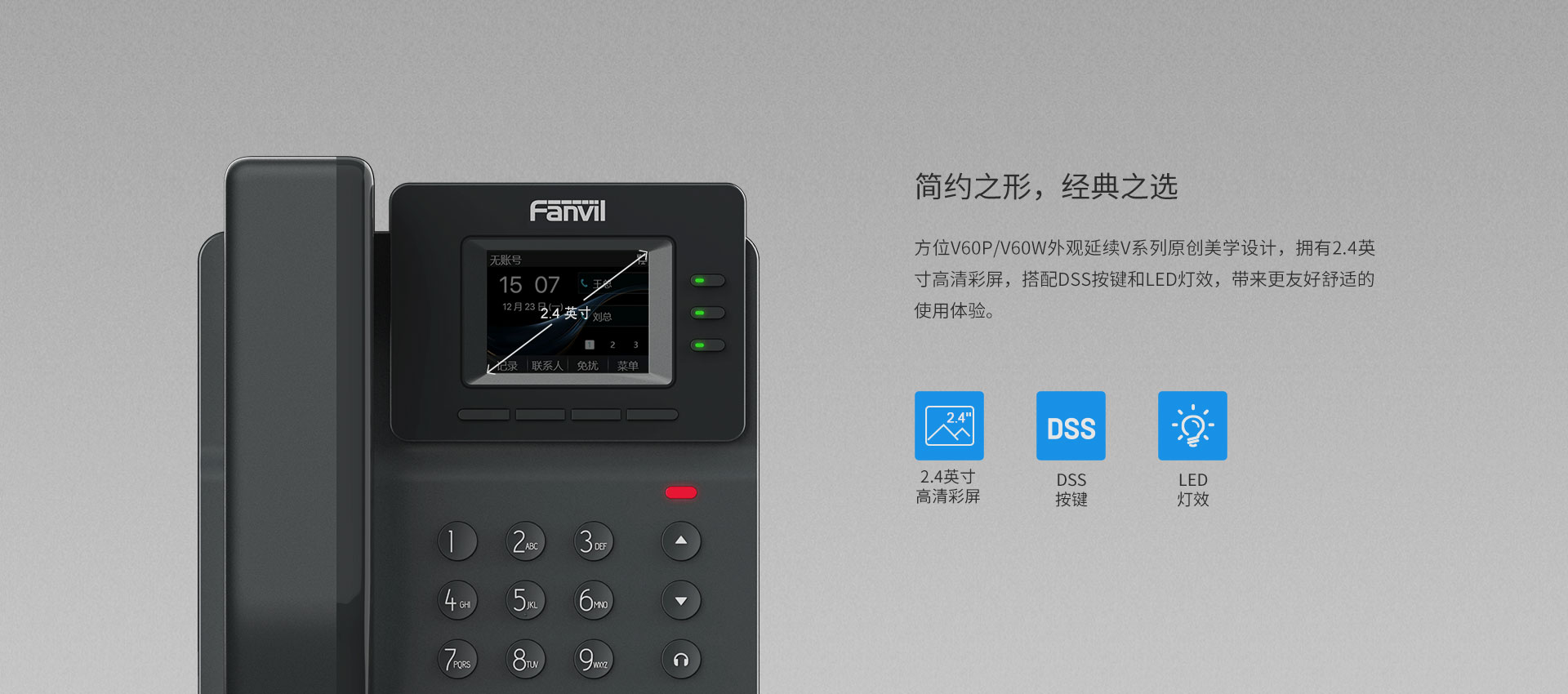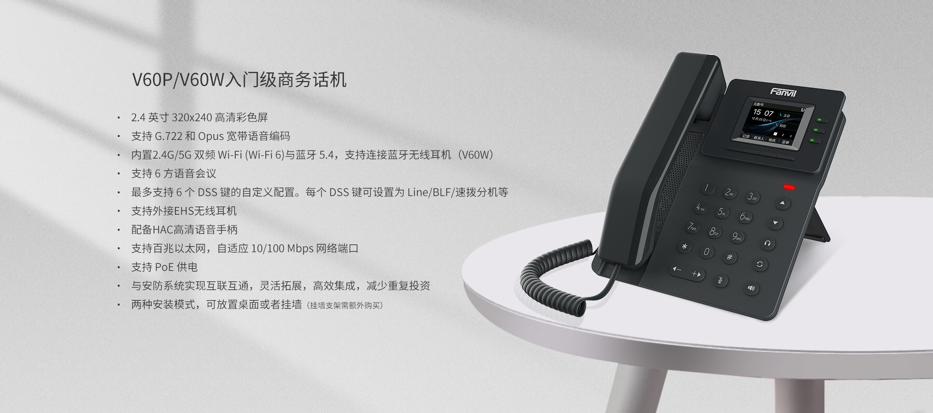 方位V60P/V60W 是一款设计简约、功能强大的入门级商务 IP 话机。它采用2.4英寸(320x240)高清彩色液晶屏,支持4条SIP线路和6方语音会议,带来清晰直观的操作体验;V60W内置蓝牙5.4与2.4G/5G 双频Wi-Fi,支持Wi-Fi 6,可满足不同企业的应用场景需求,为用户提供卓越的交互和舒适的即时互联沟通体验。