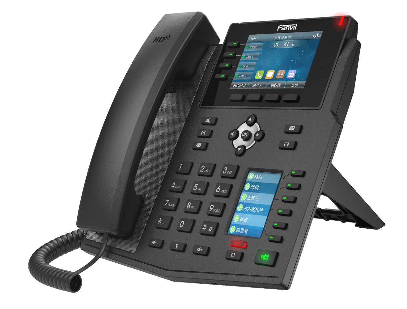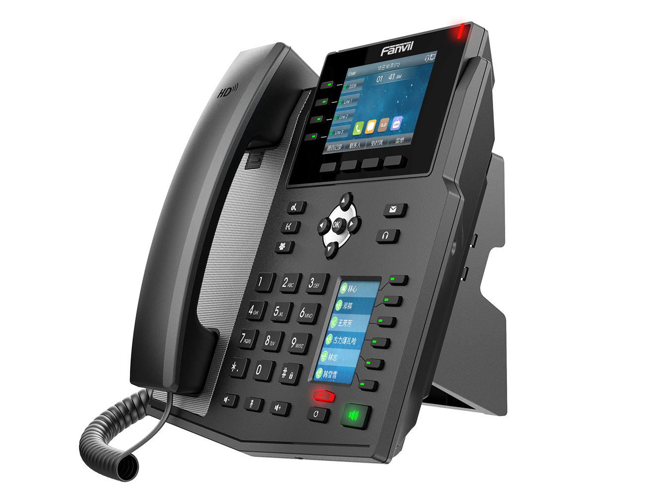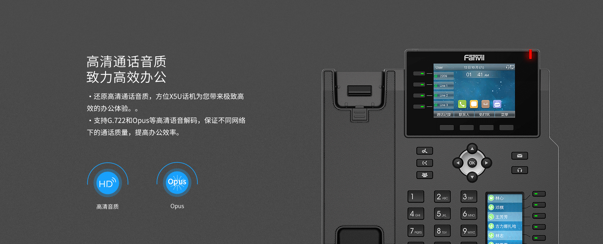 拥有商务优雅的外观,两个高分辨率彩色显示屏,便捷高效的可编程按键以及16条SIP线路,X5U企业IP话机为您带来更高的工作灵活性。方位X5U话机拥内置蓝牙功能,可直接连接蓝牙耳机;同时支持G.722和Opus等高清语音编码,无论处于高频段网络或低频段网络,都能为用户提供沉浸式高清语音体验,全面满足客户的需求。
