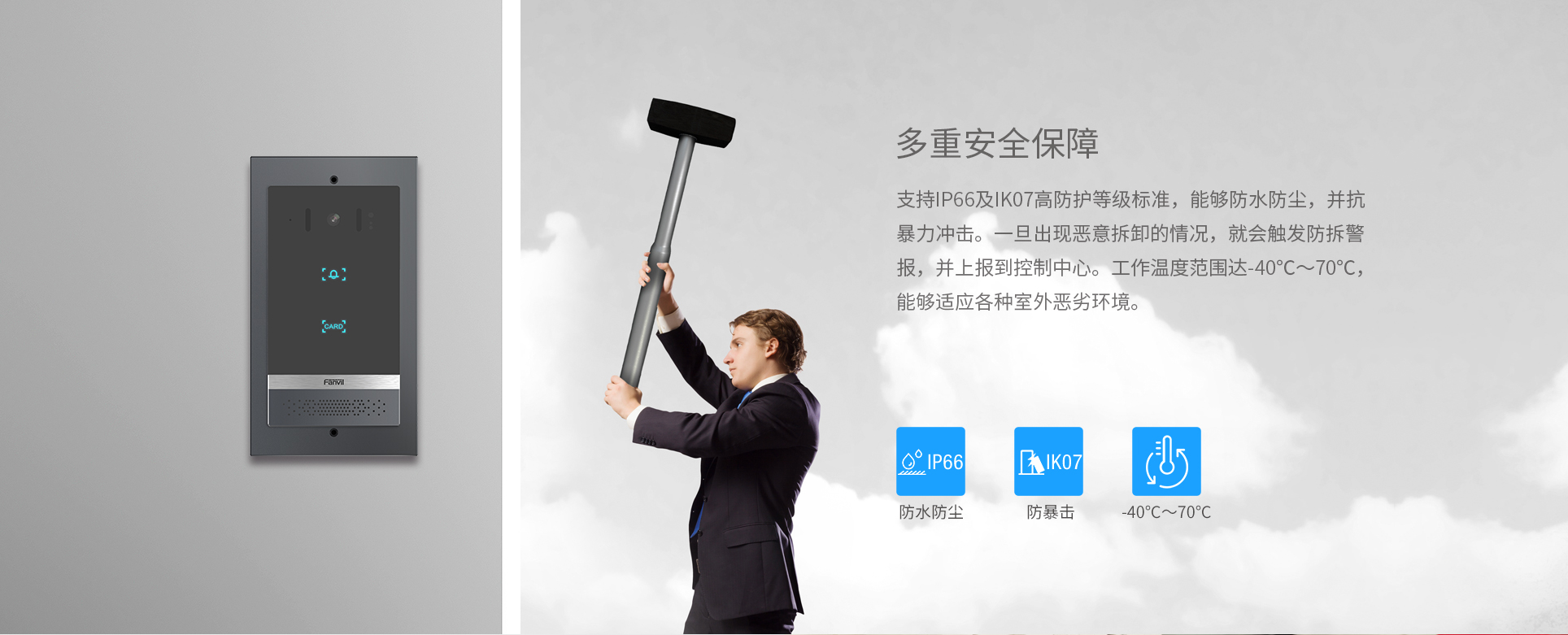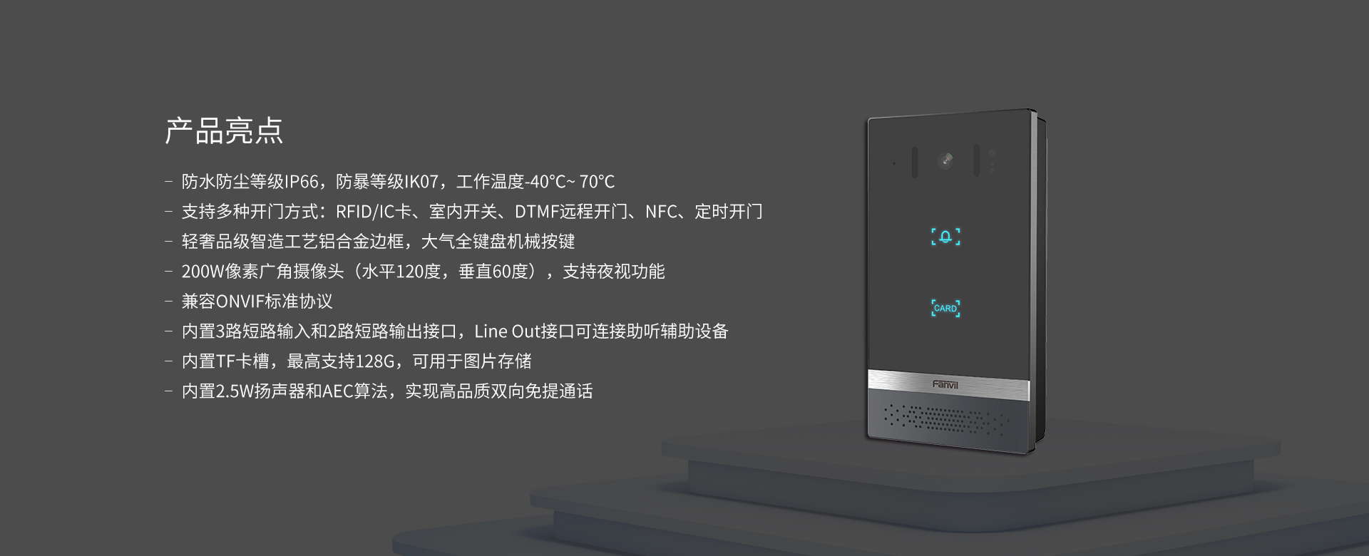 i61是集门禁、对讲和安防功能于一体的SIP门禁产品。i61采用极具科技感的设计和轻奢级智造工艺,配备1个速拨触摸按键。i61安全系数高,具备IP66及IK07高防护等级标准,适用于户外场景。它支持多种开门方式,实现门禁管理;配备200W像素摄像头,一键进行音视频通话。i61支持SIP协议和ONVIF协议,支持安防设备联动,兼容各大主流平台,可定制成各类场景解决方案,适用于各种高级公寓楼、办公楼、社区和工业园区中。