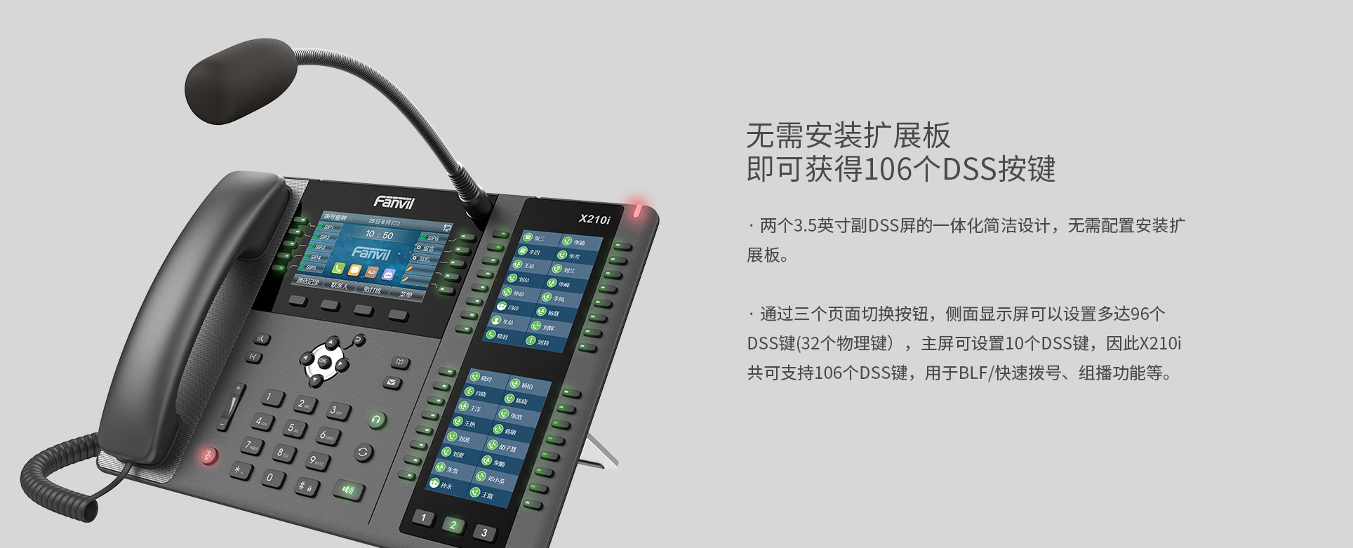 X210i是专门针对行业用户需求研发的一款可视寻呼台产品,配备鹅颈麦克风,支持高清免提通话。带有智能可编程按键,可设置一键呼叫功能提高企业沟通效率。兼容标准SIP协议,可作为监控中心、领导办公室管理主机使用,可对管理辖区内的主机和分机进行呼叫、双向对讲、监听/监视、广播喊话。X210i能够让企业最大化地提升日常业务管理效率和应急情况处理能力。