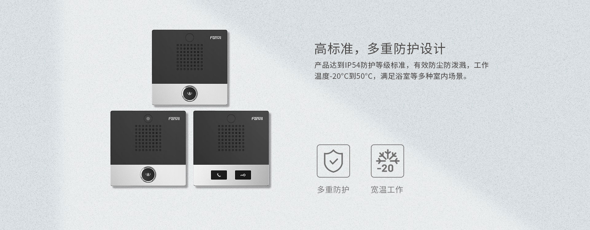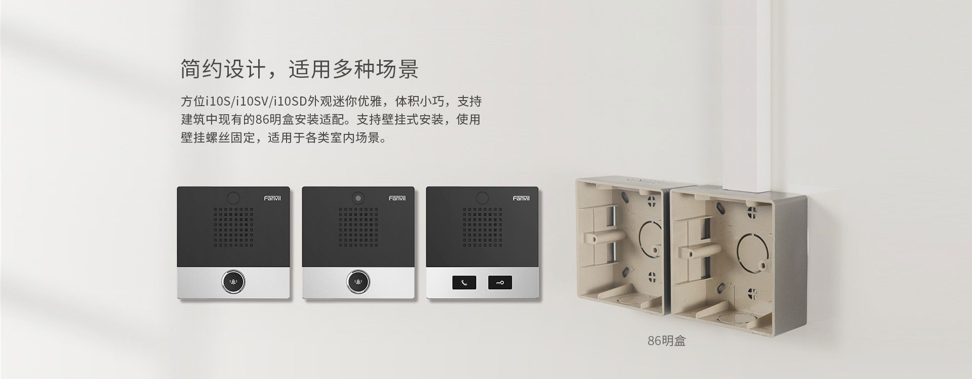 方位i10S/i10SV/i10SD 是一款外观小巧,功能强大,集智能安防、音视频对讲和广播功能于一体的SIP 对讲产品。i10S/i10SV/i10SD 支持壁挂式安装,防护等级满足IP54标准,可以有效地防尘防泼水,适用于多种室内外场景,可以为用户提供优质的通讯对讲服务。