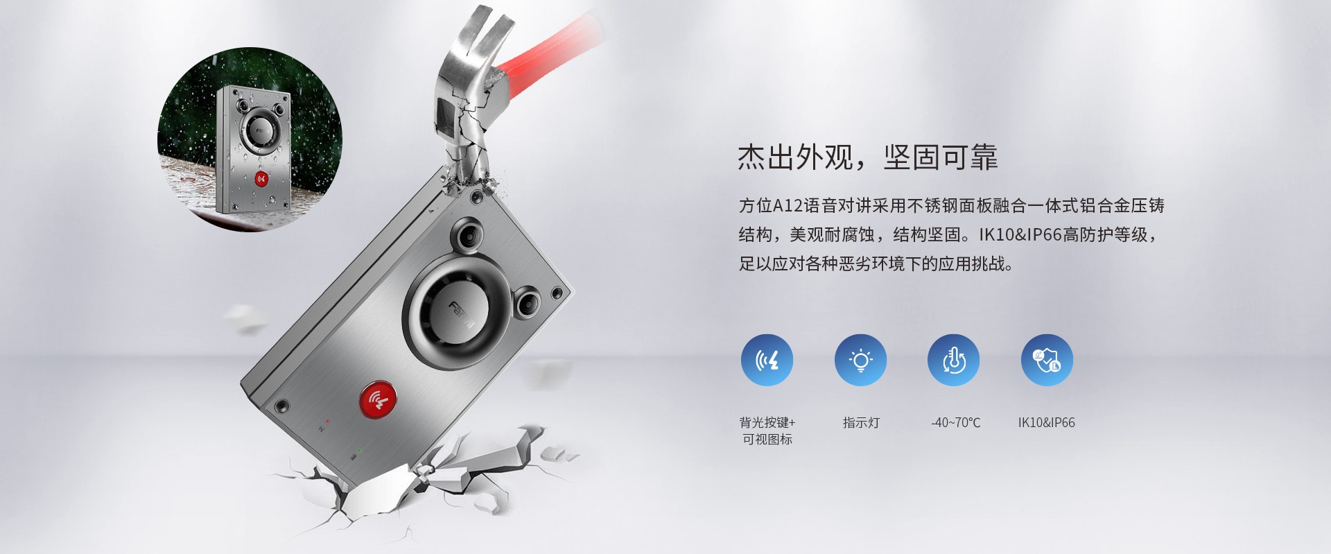 方位A12语音对讲是方位新一代的对讲产品,采用10瓦喇叭和独特的涡轮音腔设计,成就卓越音质,带来震撼音效。利用方位先进的双麦降噪和语音增强算法,实现复杂场景下的清晰拾音。该产品融合不锈钢面板与一体式铝合金压铸架构,集美观、耐腐蚀与IK10防暴、IP66防护等级于一身,无畏恶劣环境挑战,彰显极致耐用性能,满足行业对产品的严苛要求。