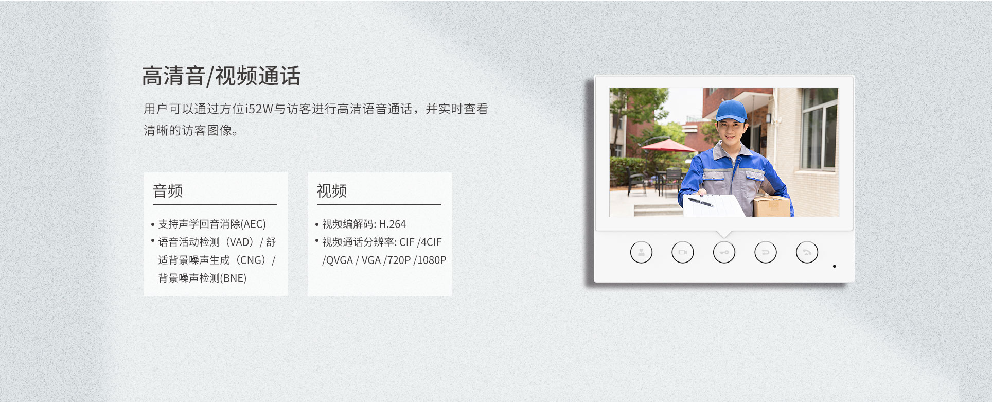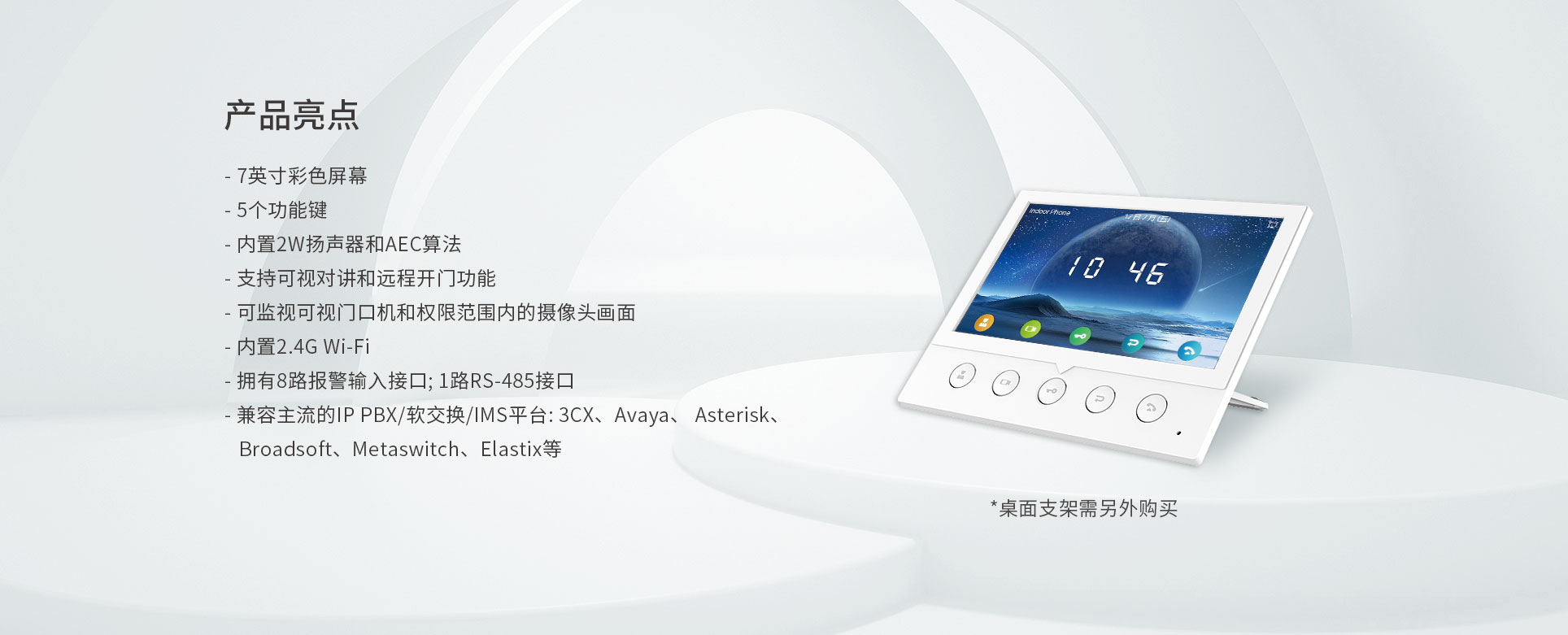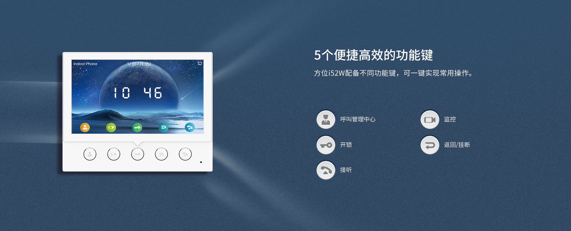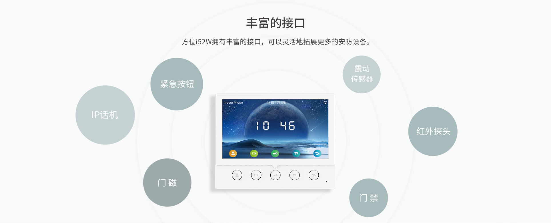 方位i52W是一款7英寸彩屏SIP室内机,拥有5个功能键,可实现一键远程开门、快速拨号、查看监控等多种功能,高效便捷,适用于各种室内场景。方位i52W拥有丰富的接口,可以灵活拓展报警器等安防设备,为用户提供可靠的安全保障,营造安全舒适的生活环境。