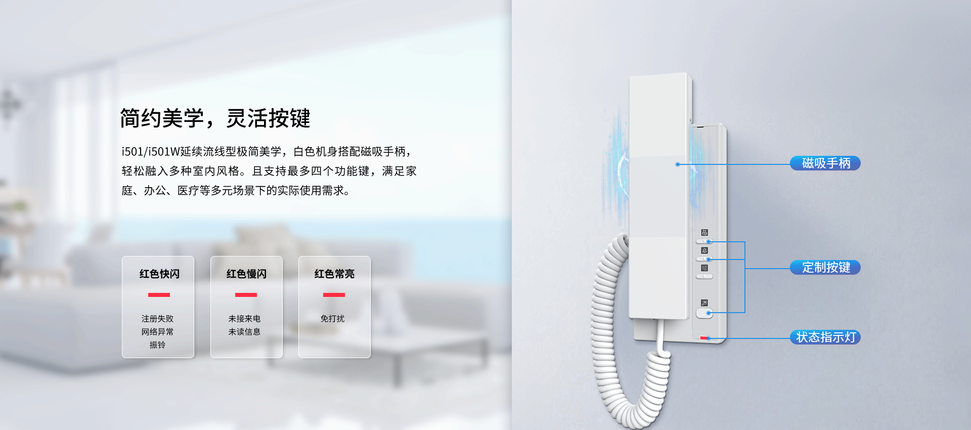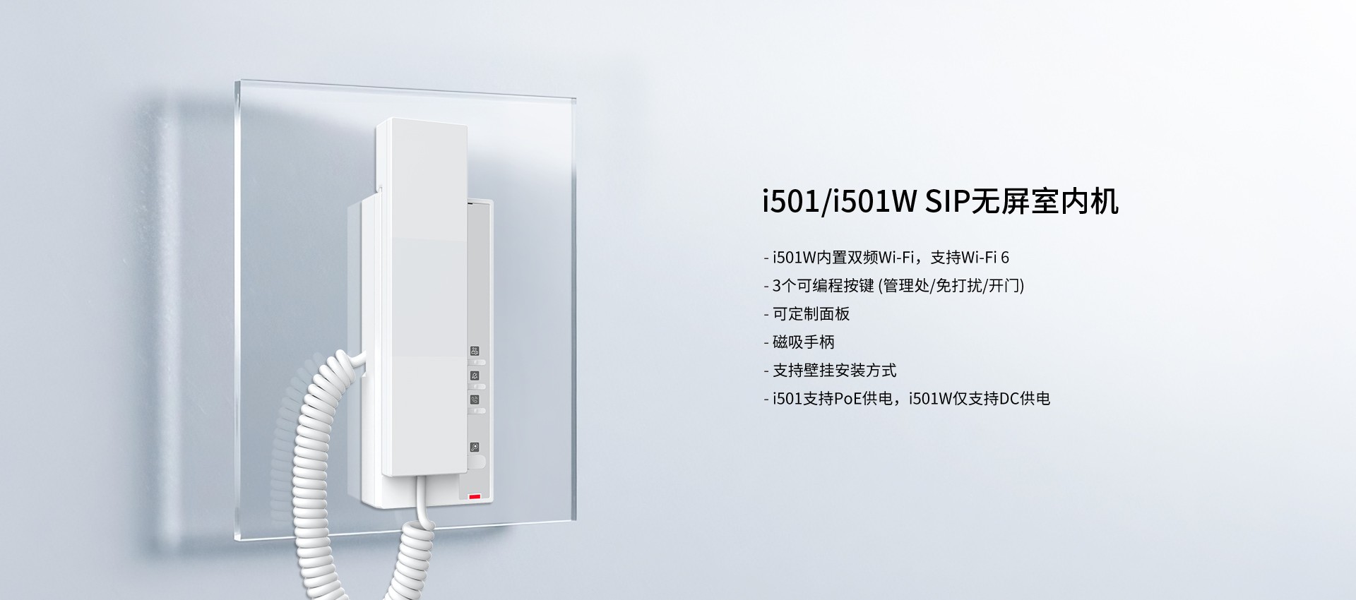 方位 i501/i501W SIP无屏室内机,搭配磁吸式手柄,支持远程一键开锁,减少复杂操作,提供便捷的访客呼叫服务。支持 2 条 SIP 线路与 1 路短路输入接口,适用于住宅小区、办公楼宇、酒店等多种场景。可清晰实现与门禁的音频通话及控制,提供稳定便捷的呼叫体验,打造安全、舒适、智能的日常环境。