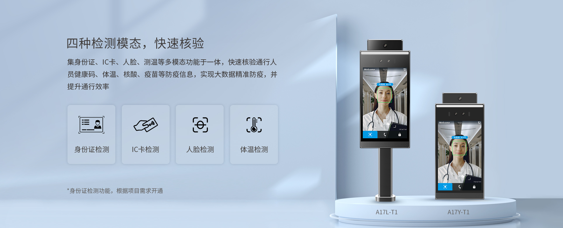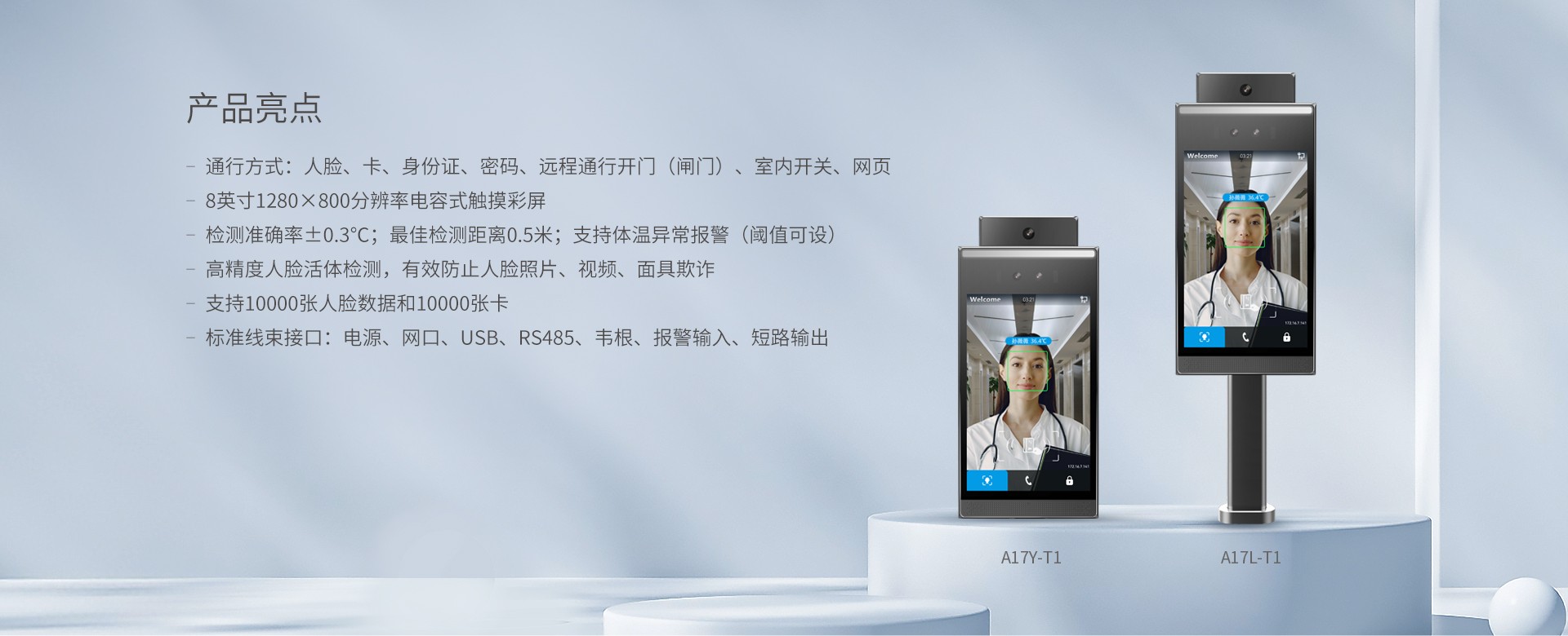 A17L-T1是一款集身份证、IC卡、人脸、测温等多种检测识别功能于一体的数字哨兵防疫终端。它采用时尚超薄的设计风格,全金属机身打造,高档铝合金高光边。A17L-T1配备8英寸高清彩色触摸屏,内置高清双目摄像头及先进的算法,支持活体检测、红外测温功能,并使用标准的SIP协议进行通讯对讲。可广泛应用于社区、楼宇、医院、学校、党政机关、交通枢纽等领域,高效助力疫情防疫和通行管控。