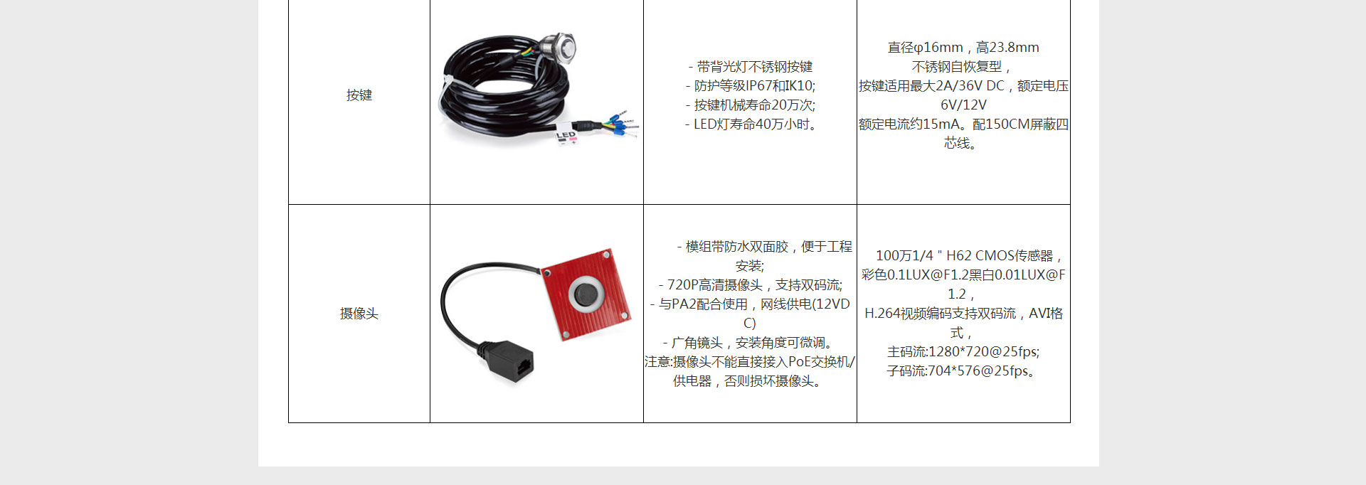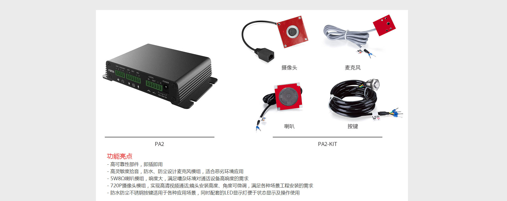 PA2-KIT是方位SIP广播对讲网关PA2配套使用的部件,它包含IP摄像头模组、喇叭模组、麦克风模组和按键模组四部分。用户使用这些部件,可快速搭建高品质的视频/音频对讲设备,省去了部件选型、匹配测试和可靠性测试等繁琐的工序,做到即插即用,快速实现设备的改装。