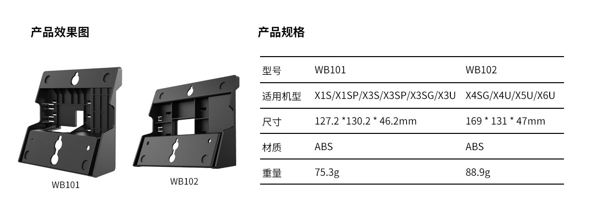 WB101&WB102 是针对话机需要采用壁挂式安装方式时推出的一款挂墙支架配件包,适配于方位多款型号话机,安装简单,节约空间。